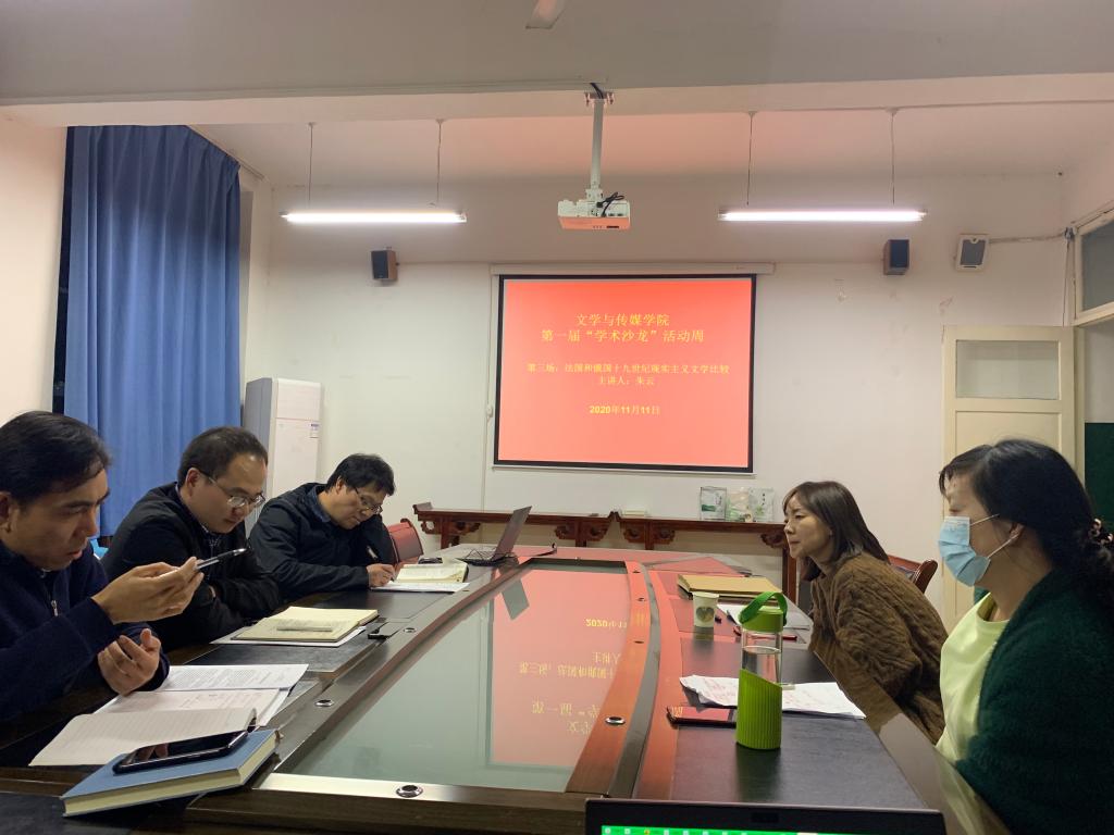 2020年11月12日晚7点半,Beat365唯一官方网站“文学理论与外国文学”学科组在2307会议室举办了第一届“学术沙龙”活动周第三次学术研讨活动。研讨主题是“法国和俄国十九世纪现实主义文学比较”,由副院长朱云主讲,全体文学理论与外国文学教师参加了研讨活动。