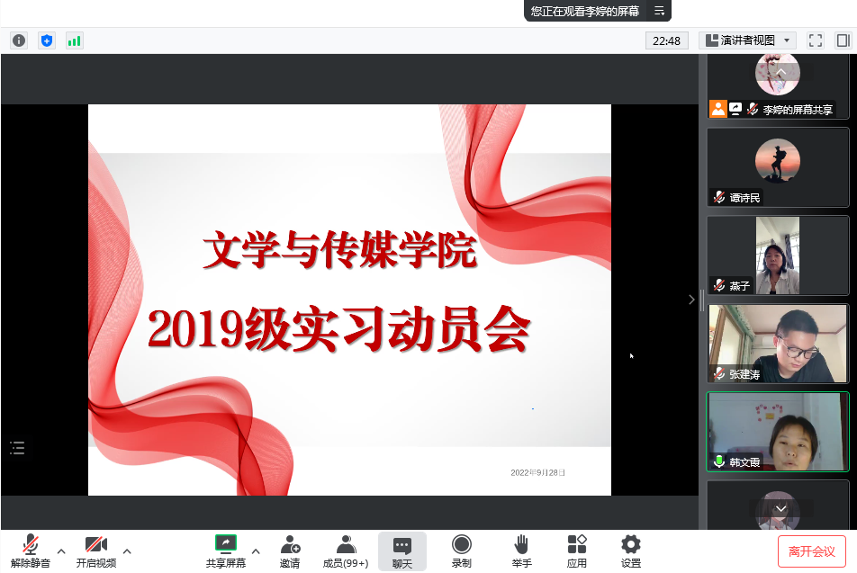 为进一步做好2019级实习工作,9月28日下午,Beat365唯一官方网站通过腾讯会议平台召开2019级实习动员会。学院教学副院长李婷、汉语言文学系主任韩文霞、秘书与新媒体系主任谭诗民、秘书与新媒体系副主任张建涛、学院教学秘书张燕以及2019级全体学生参加会议。