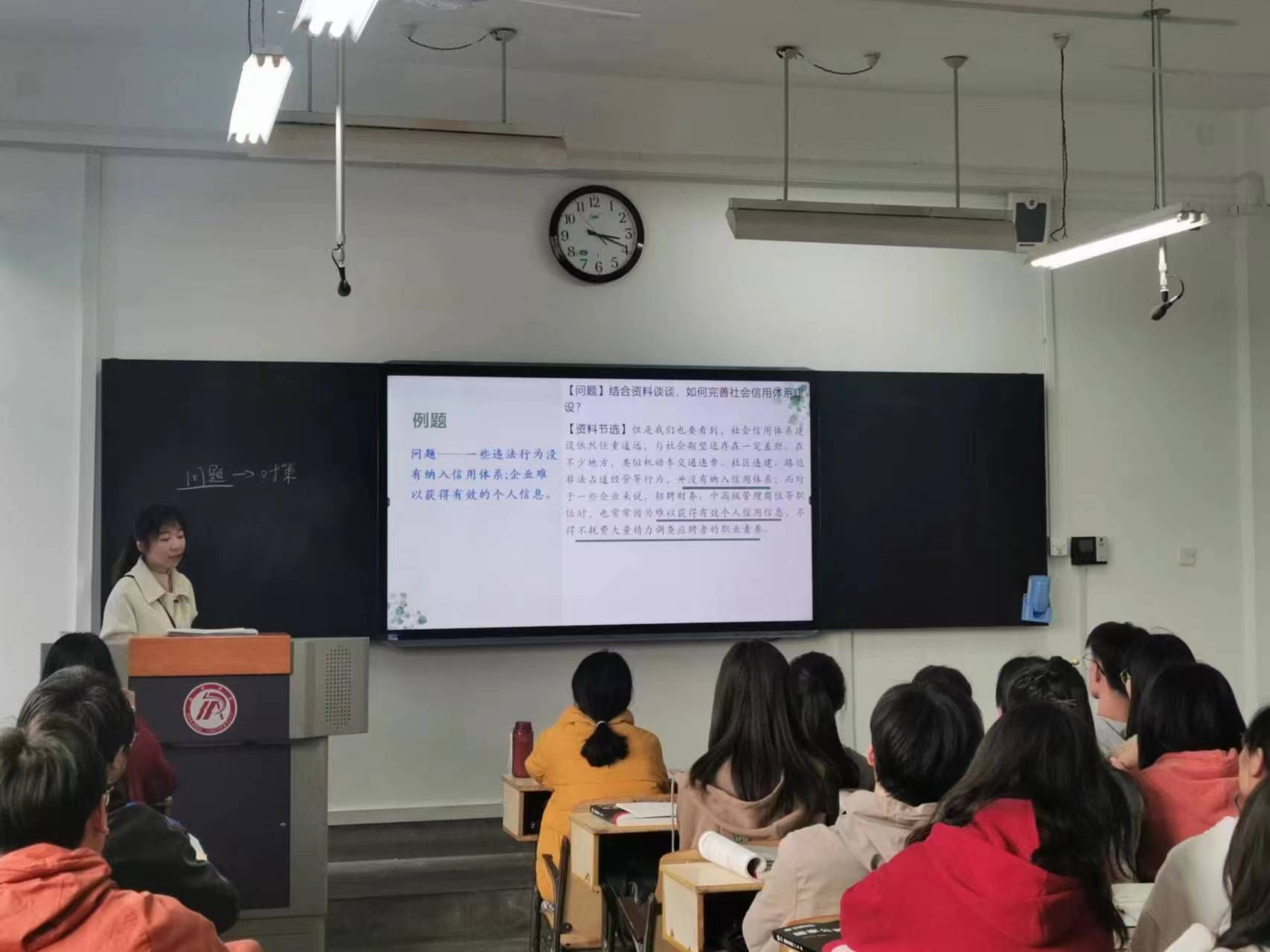 活动第一环节为公开课观摩。参与活动的教师于第6节课在1213教室集中观摩了秘书学专业谭志轩老师主讲的申论课程。谭老师重点讲解了申论中“提出对策题”的基本解析思路与作答方法。