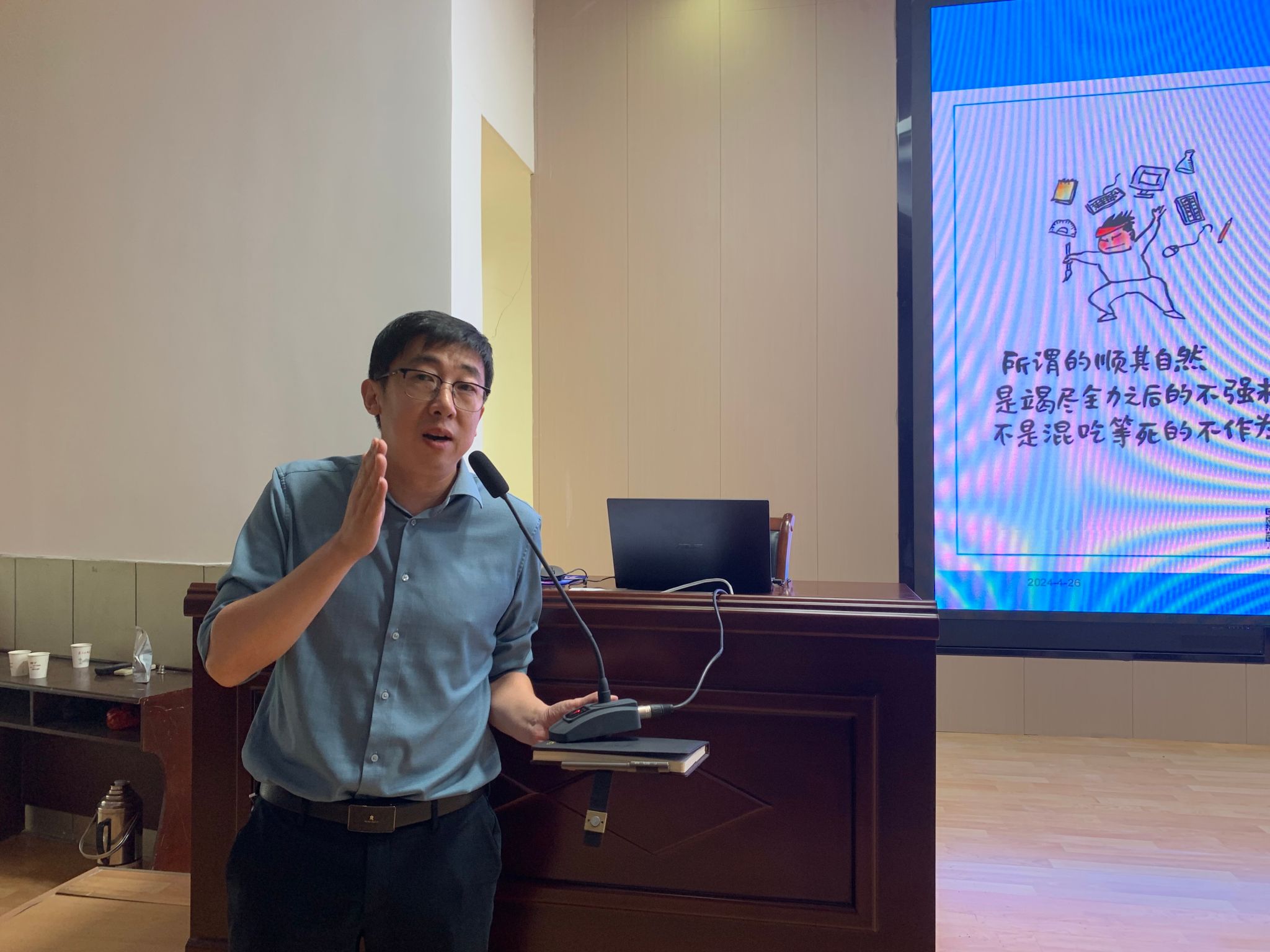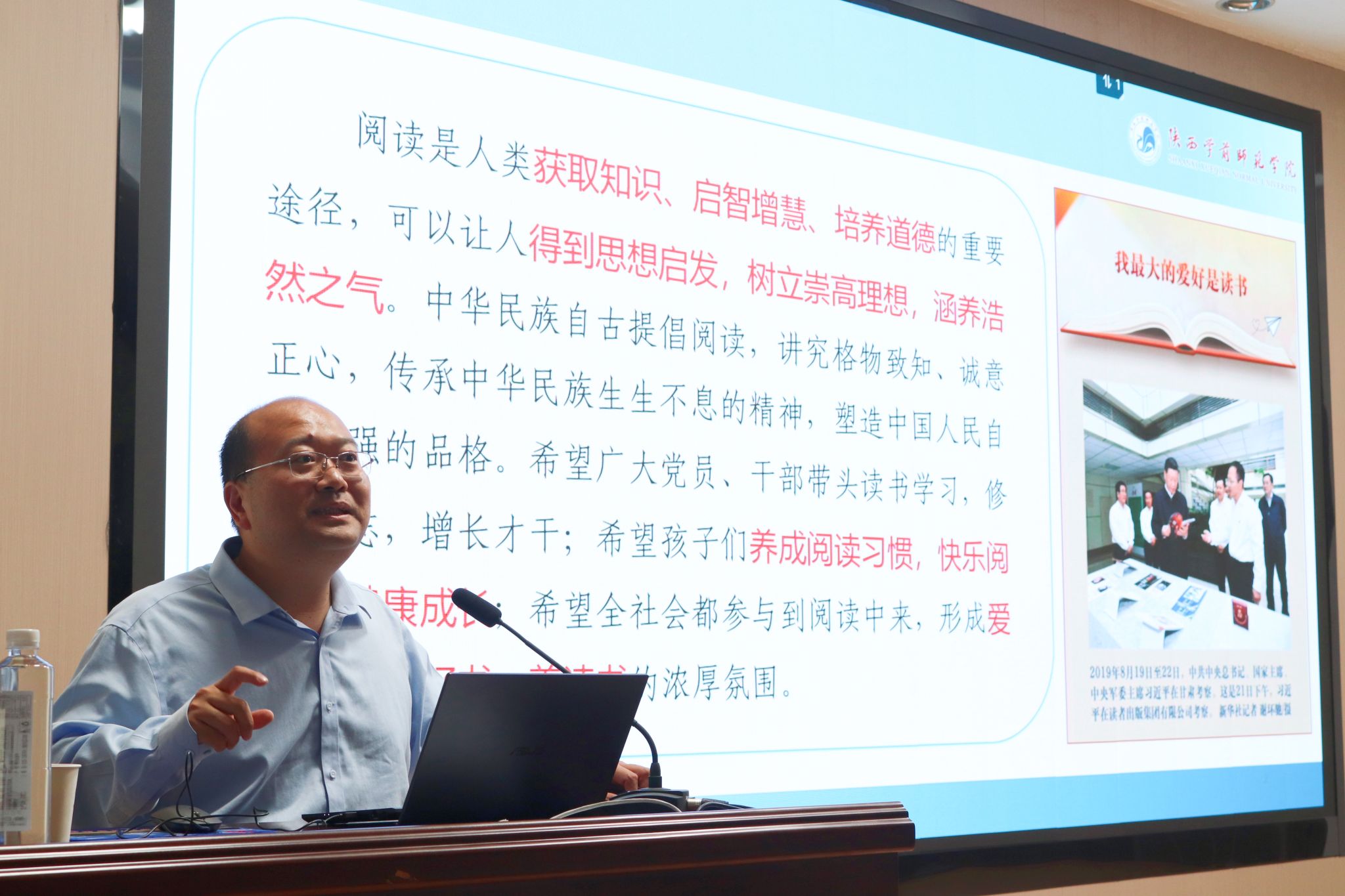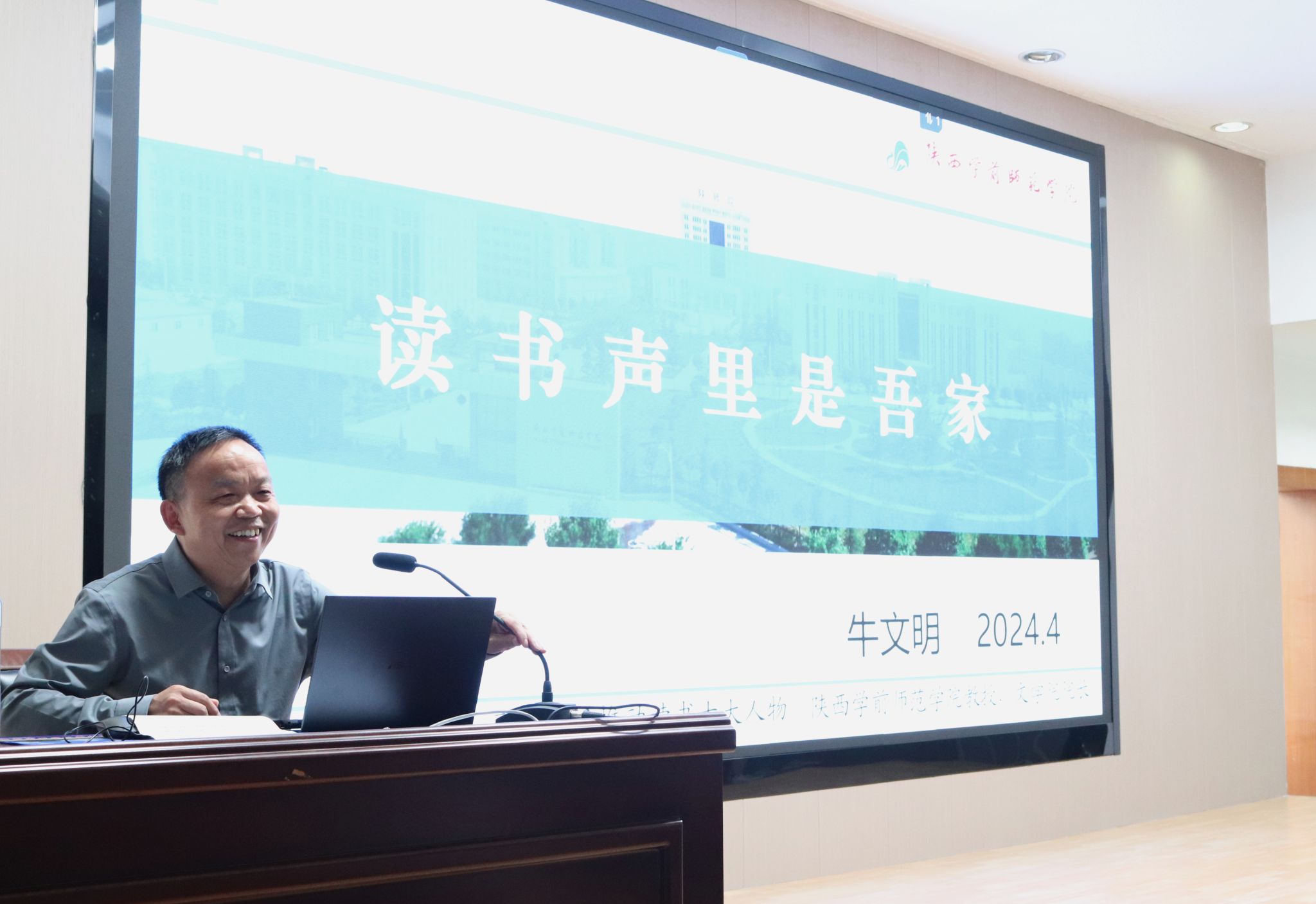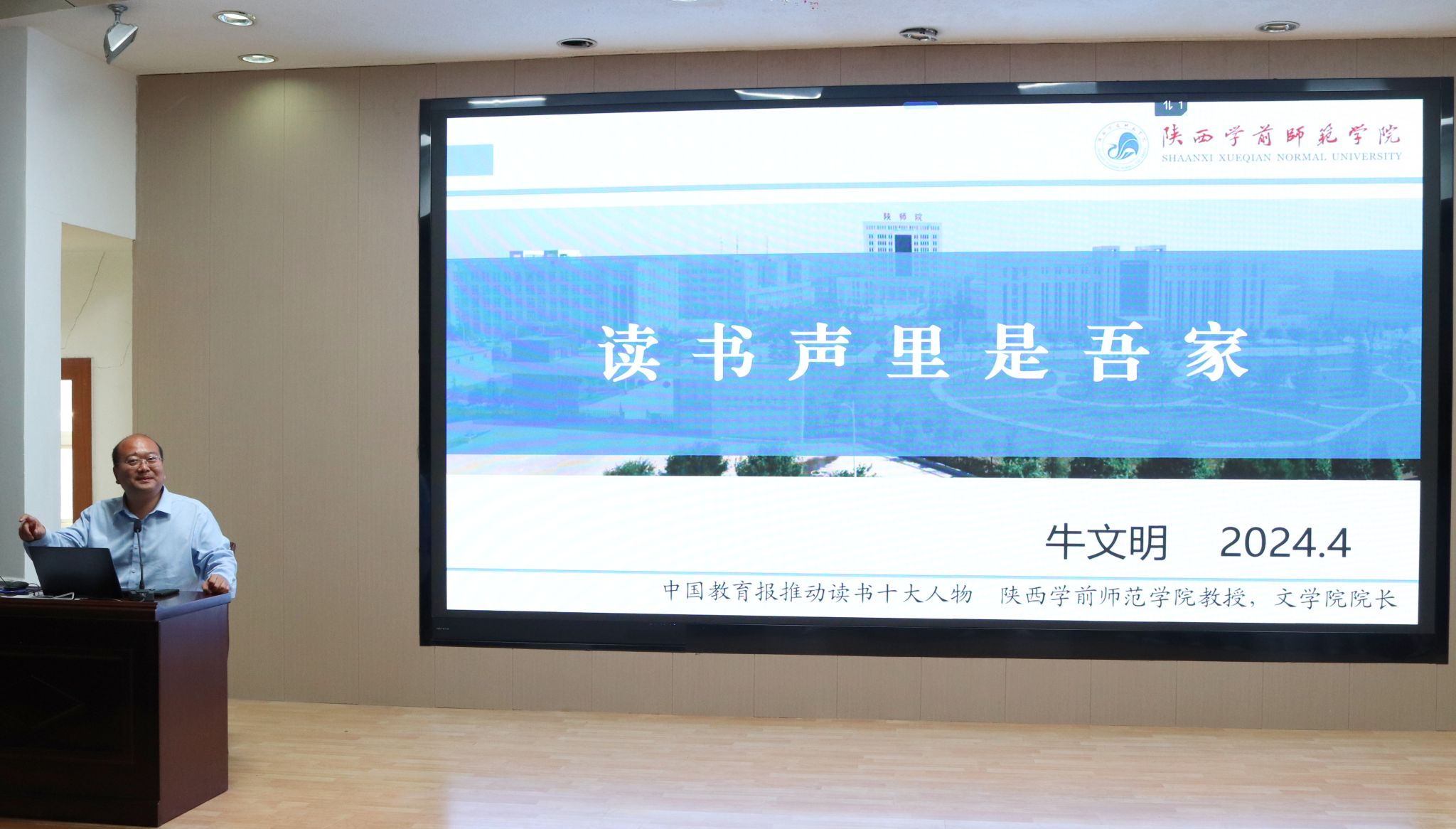4月26日下午,陕西学前师范学院文学院院长牛文明教授应邀来Beat365官网为Beat365唯一官方网站2023级学生做了“读书声里是吾家”的专题读书报告。本次报告由Beat365唯一官方网站院长杨运庚主持。
