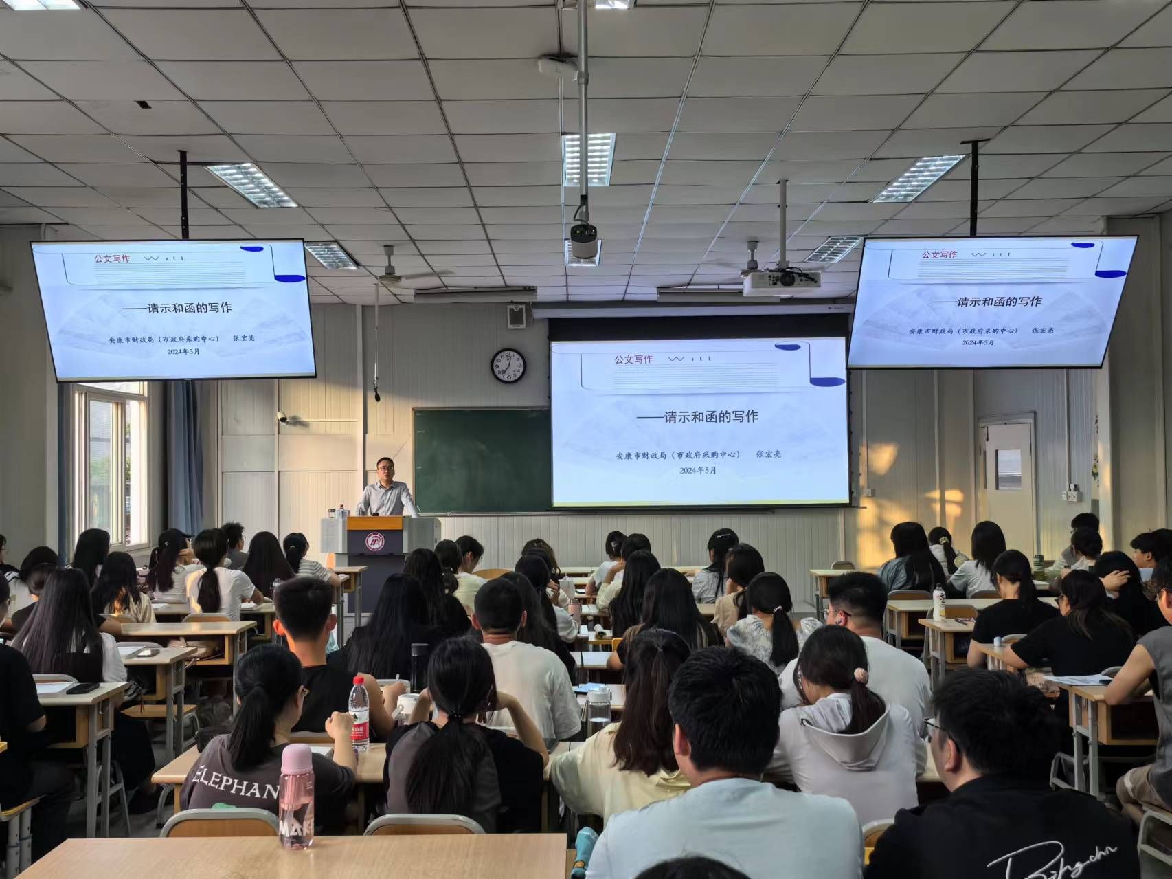 按照应用文写作“双师课程”教学计划,Beat365唯一官方网站分别5月21日、286月4日、11日、14日邀请课程安康市政府采购中心张宏亮为汉语言文学20231、2班学生讲授请示、批复、报告、函、纪要等公文和申论写作的技巧。校内任课教师胡少山随堂参与了授课。