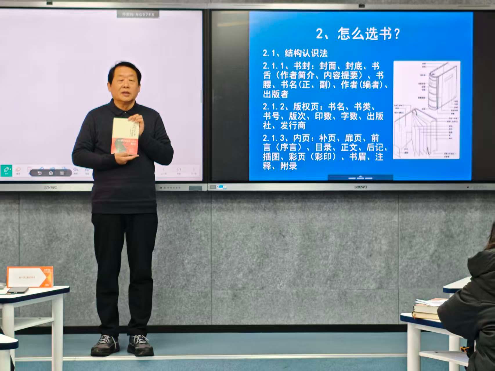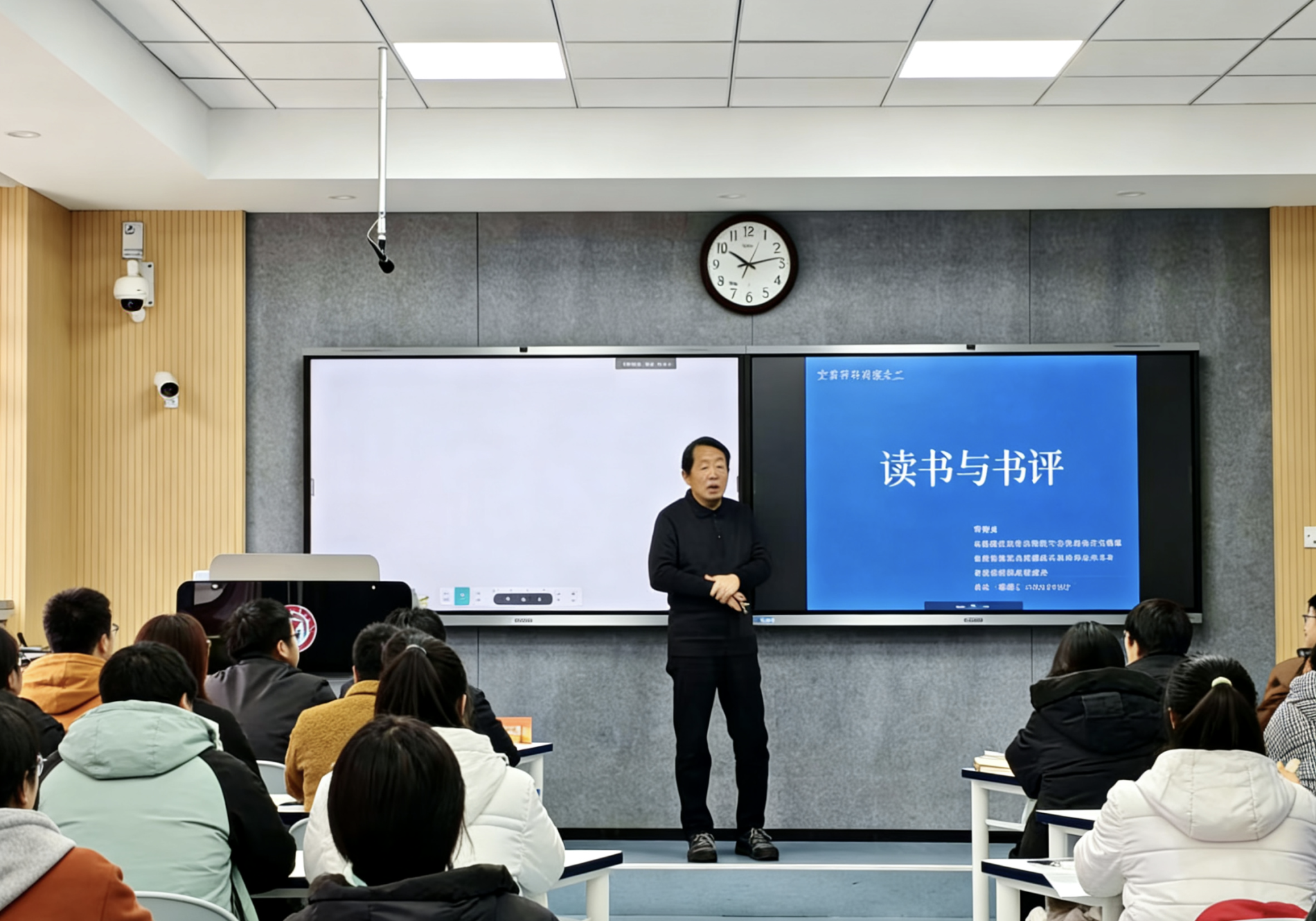 12月9日上午,原安康市图书馆馆长李焕龙应邀走进江南校区1205教室,与《基础写作》课程校内教师鲁雨溦共同为汉语言文学2025级4班学生带来一场以读书与书评为主题的专题