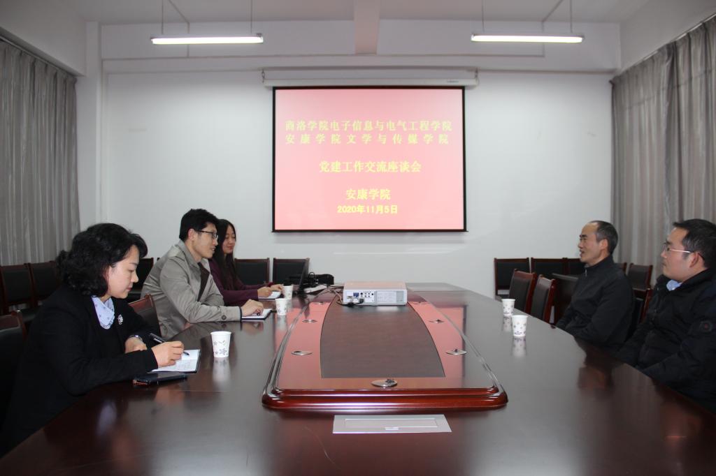2020年11月5日下午,商洛学院电子信息与电气工程学院党总支书记李英一行来我院交流学习党建和学生工作,学院党总支书记芦伟、副书记杨海蓉、团总支书记彭潇在陕南民间文化研究中心会议室接待来访并组织召开了座谈会。