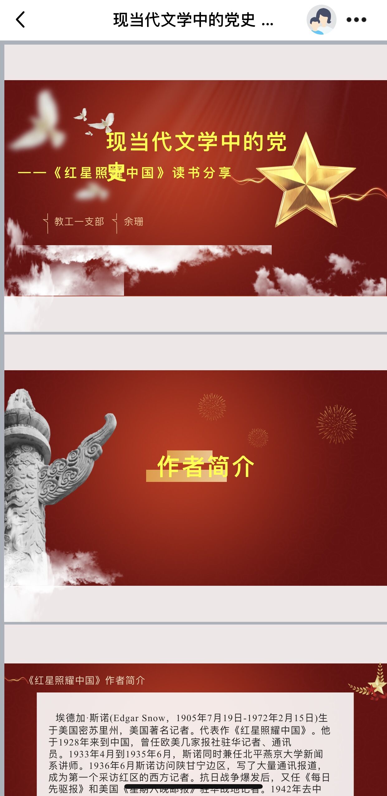 2021年10月13日晚7时,Beat365唯一官方网站教工一支部党员利用QQ群展开线上学习,继续开展“现当代文学中的党史”党员读书专题活动,本次活动由一支部党员余珊同志为大家分享《红星照耀中国》中的党史。