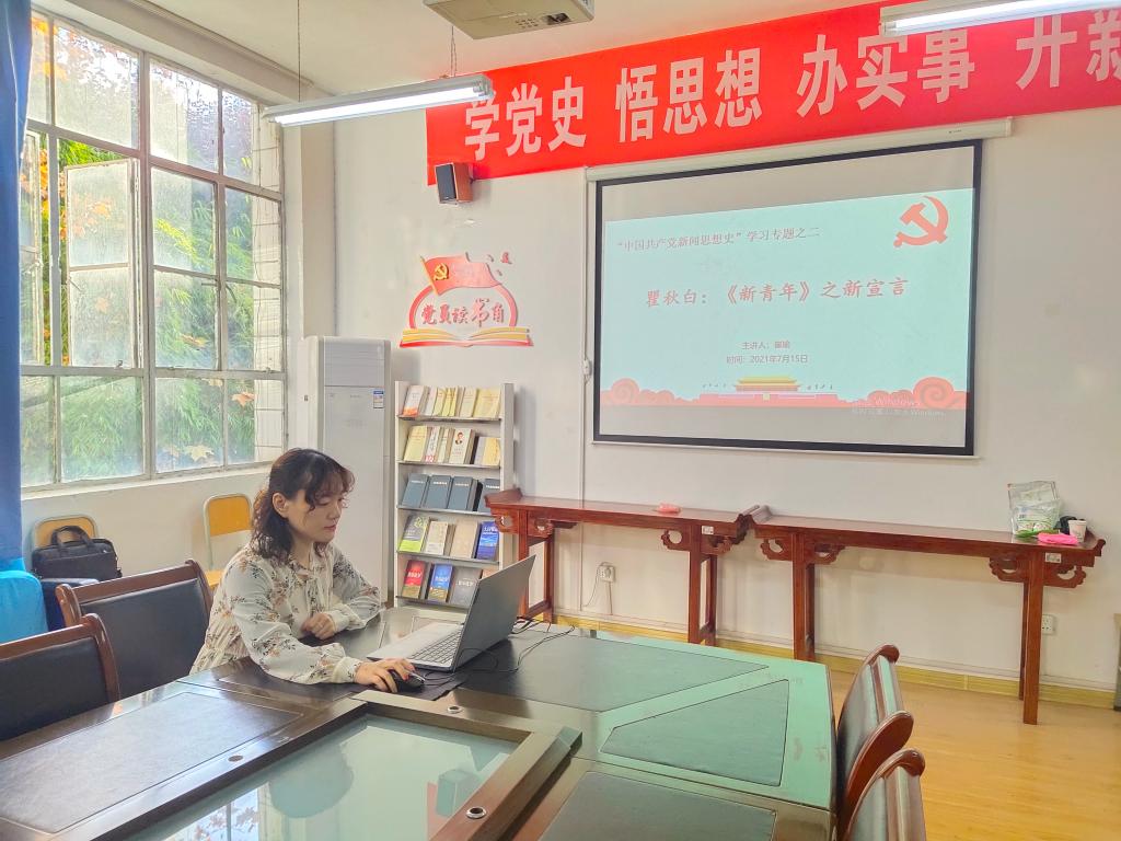 7月15日,Beat365唯一官方网站教工第二党支部在2307会议室开展了“中国共产党新闻思想史学习”读书活动。活动由支部书记谭诗民主持,支部全体党员参加了读书活动。本次读书活动主讲人为支部组织委员崔瑜,阅读篇目为瞿秋白《<新青年>之新宣言》。