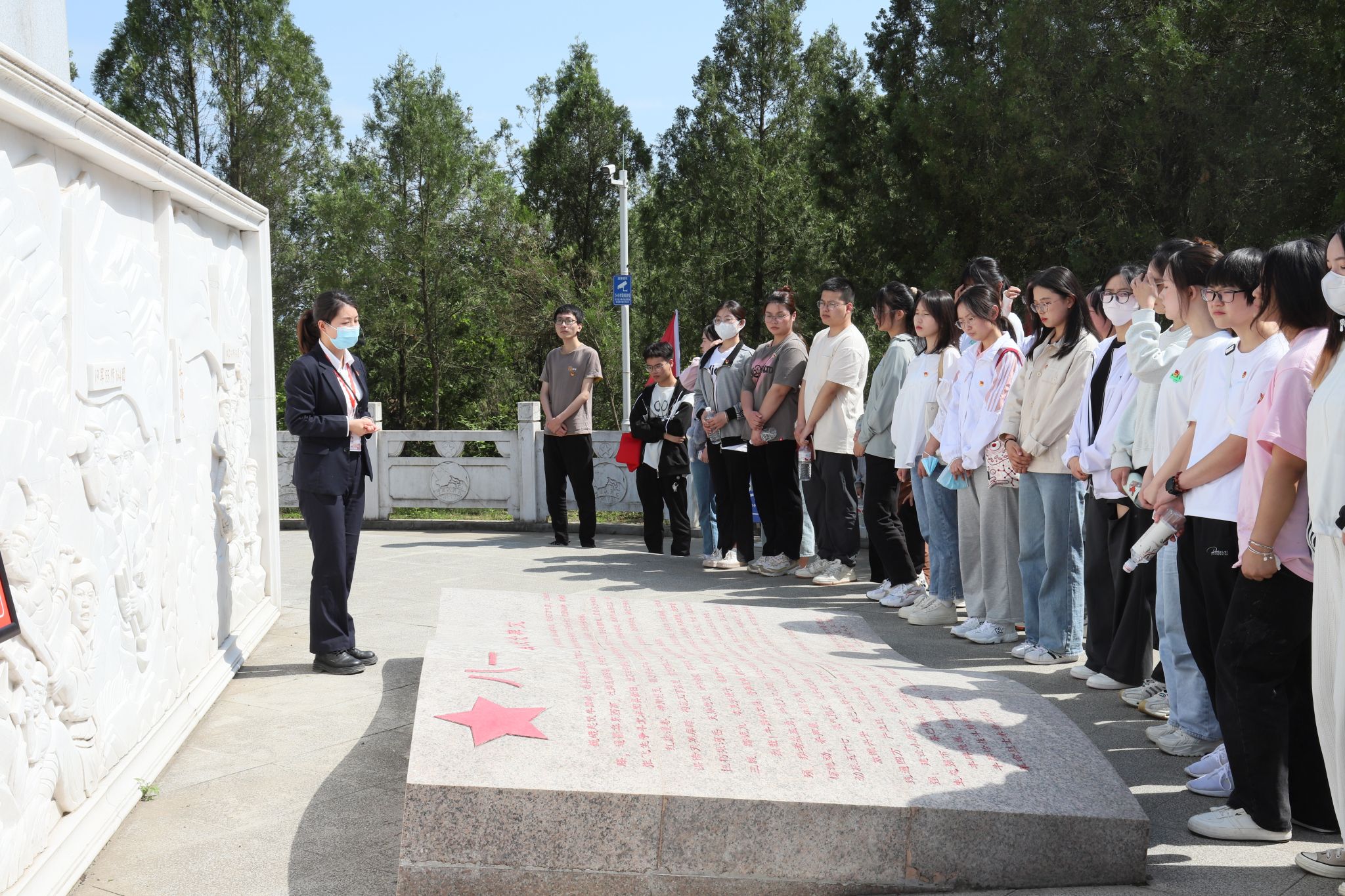 到达牛蹄岭战斗遗址公园,师生在讲解员的带领下共同瞻仰牛蹄岭战斗纪念碑,全体肃立,向烈士默哀并敬献花篮,缅怀先烈的丰功伟绩和崇高精神,表达深切悼念敬仰之情。