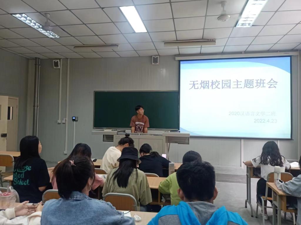 班会上,各班班长从烟草中含有的对人体有害成分、吸烟的危害、二手烟的危害等方面,通过图片、视频等形式,结合实际案例,向同学们详细讲解了烟草及电子烟对青少年身心健康的危害,倡导抽烟的同学们尽早戒烟,养成健康的生活习惯,监督自己和身边的人不在禁烟场所吸烟,为构建良好的生活学习环境而努力。