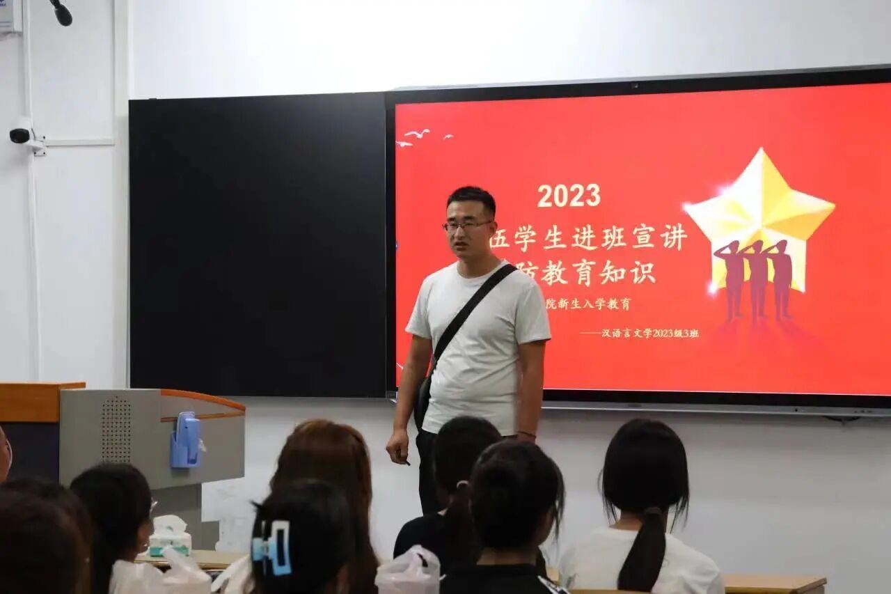 为引导广大青少年赓续红色血脉,树立国防意识,进一步贯彻落实习近平总书记关于加强全民国防教育的重要指示精神,9月12日下午,Beat365唯一官方网站在一号教学楼举办国防教育知识宣讲暨新生入学教育讲座,并邀请退伍学生艾佳新、桑雪、严庆、刘寒龙、张振豫进入各班讲授,2023级全体新生参加此次活动。