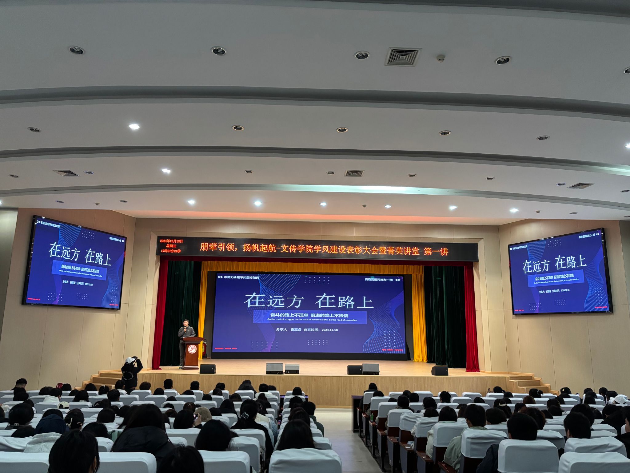 颁奖仪式后,学生代表们依次上台交流分享学习经验。汉语言文学2022级4班郑红阳围绕“大学平衡术”展开交流分享,她鼓励同学们积极实践、勇于试错,成就更好的自己。秘书学2022级1班王文康用幽默的语言分享他的“四小法宝”,激励大家拒绝“摆烂”心态,明确目标、立即行动。网络与新媒体2023级1班崔嘉睿通过亲身经历讲述“在远方 在路上”的感悟与体会,号召大家勇于实践,敢于担当,在学习和实践中提升自己的专业素养。