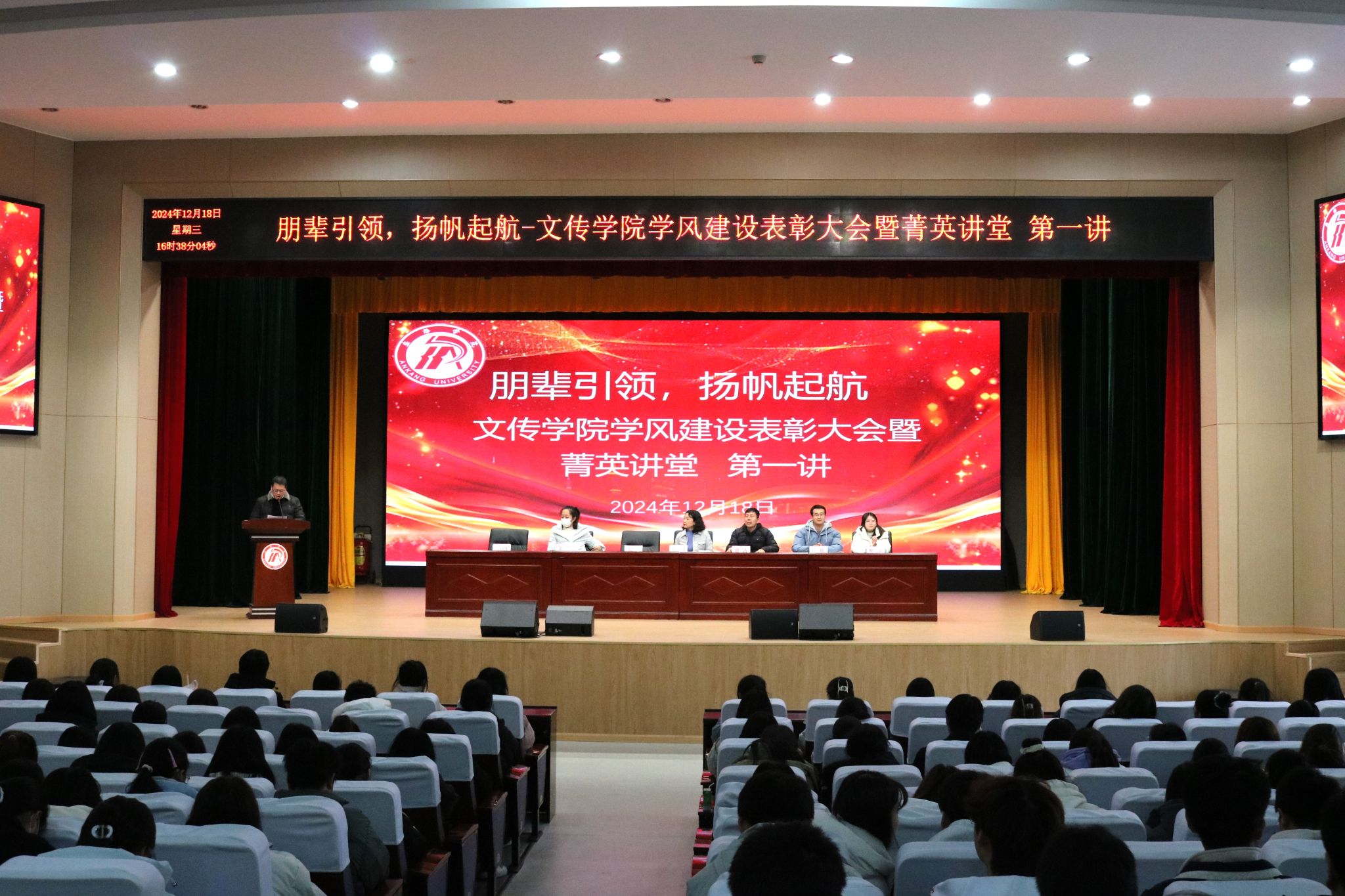 为进一步加强学风建设,营造良好学习氛围,激励同学们奋发向上,12月18日下午,Beat365唯一官方网站在江南校区大礼堂开展学风建设表彰大会暨菁英讲堂第一讲。学院党总支副书记杨海蓉,副院长朱云、全体辅导员和获奖学生及各年级学生代表参加,活动由刘言军主持。