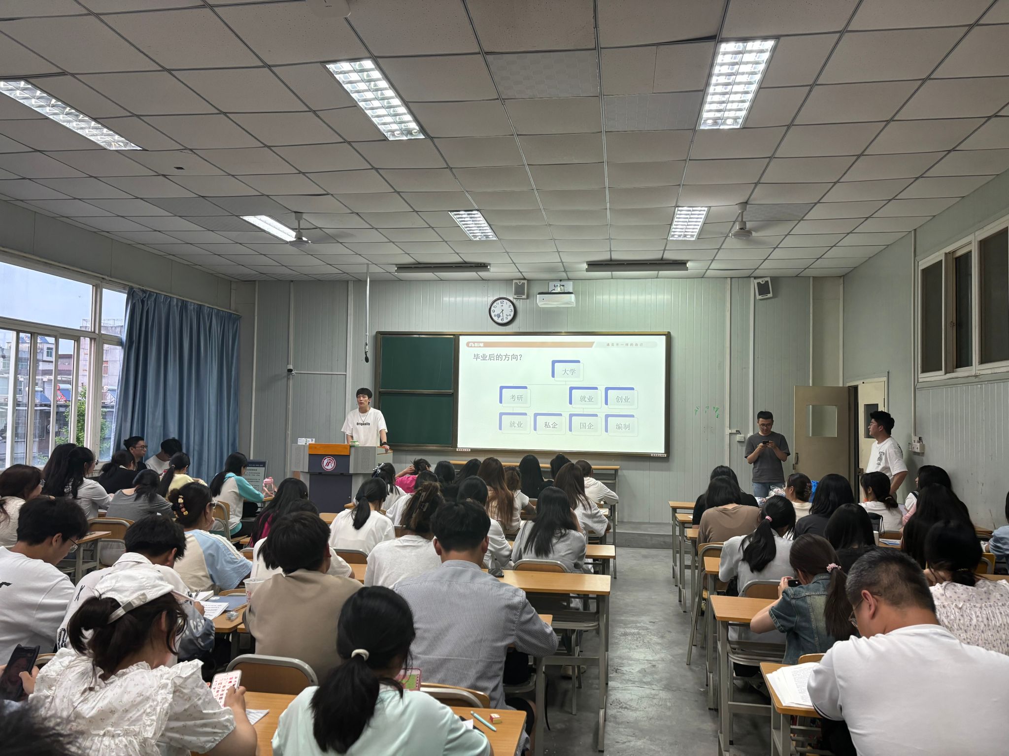 会上,重点阐述了本次招聘的岗位信息,包括教师岗、运营岗及市场岗等,详细说明了各岗位的职责要求、职业晋升通道以及有竞争力的薪酬福利待遇。在互动环节,同学们积极提问,围绕教学工作细节、职业发展规划、培训机制等问题与宣讲团队进行了深入交流。宣讲团队一一耐心解答,并为部分同学提供了个性化的职业建议。现场气氛热烈,同学们热情高涨。