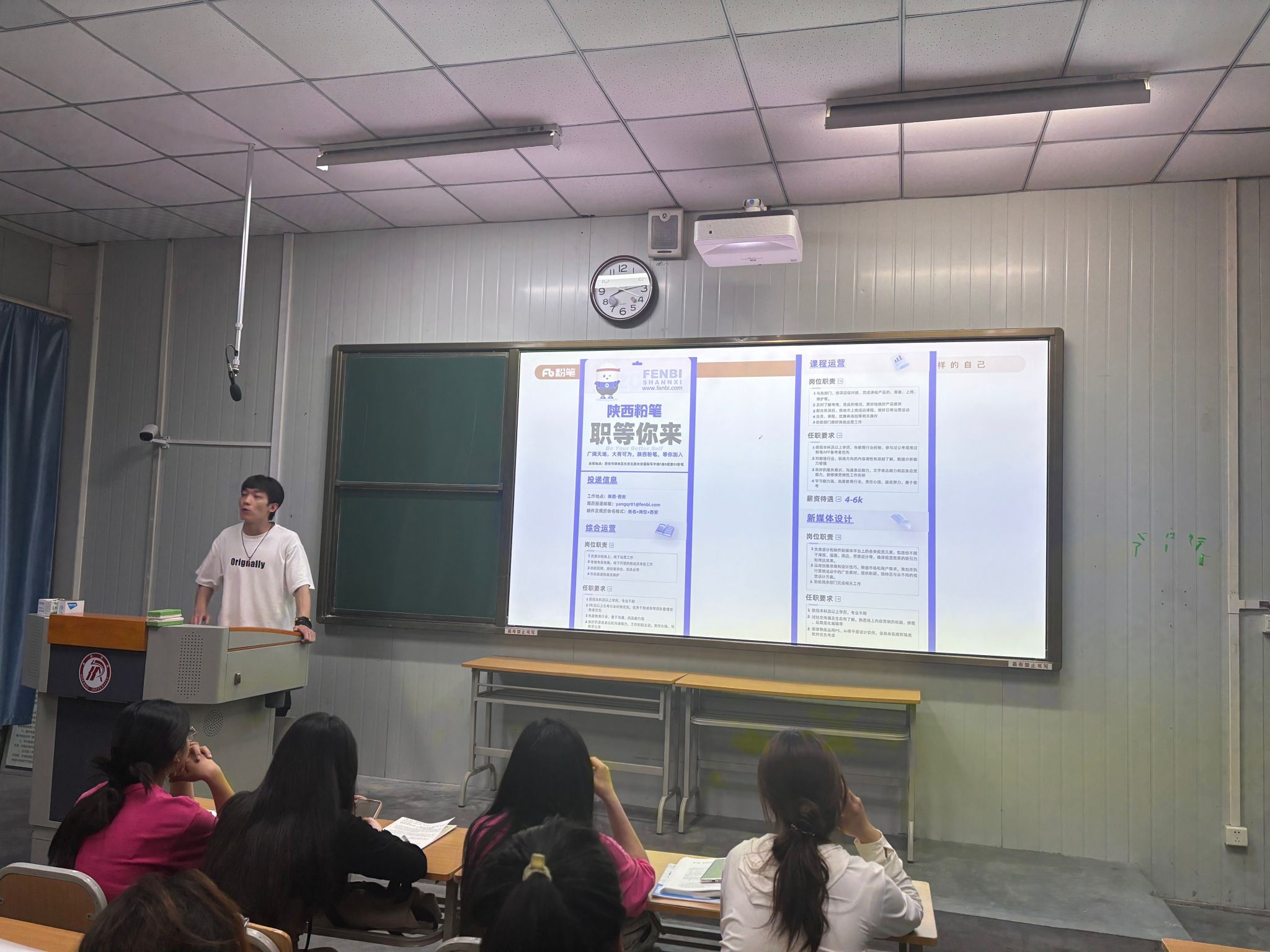 宣讲伊始,粉笔教育安康分校招聘负责人详细介绍了集团的发展历程、企业文化与业务范围,展示其在公职类考试培训领域的卓越成就与良好口碑。特别针对安康分校的师资力量、教学特色、学员服务等方面进行深入讲解,使同学们对其教育理念和工作环境有了直观清晰的认识。