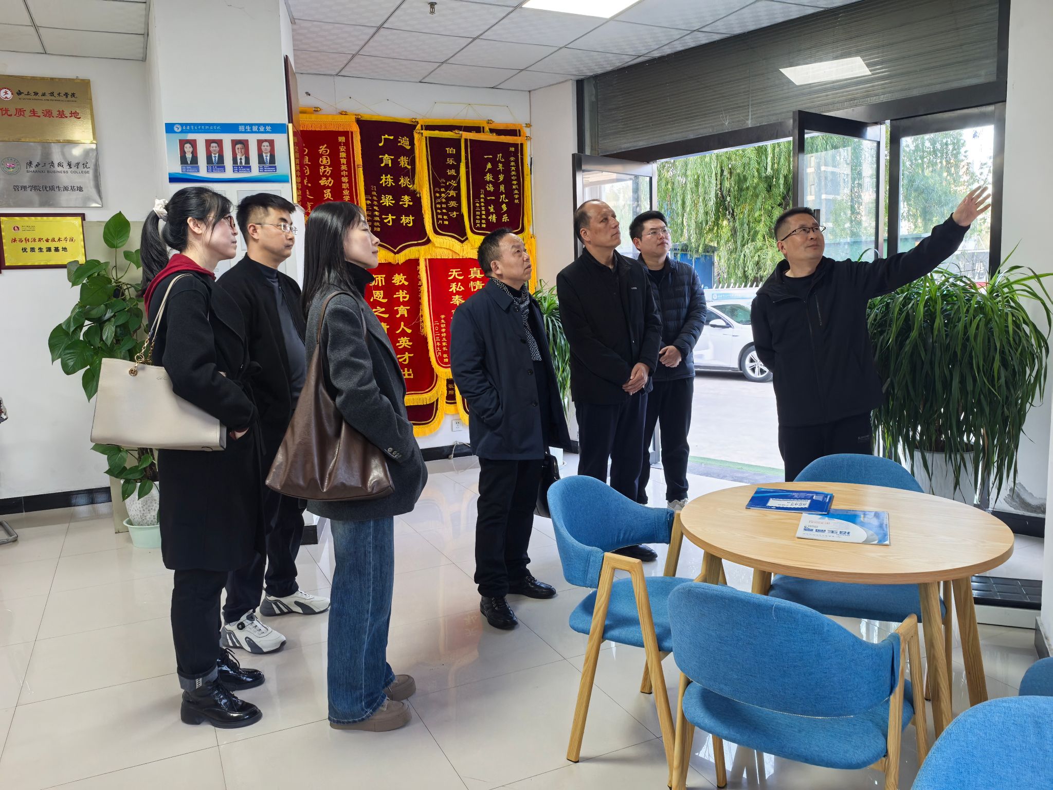 随后,团队一行走访了安康育英中等职业学校在校长兼党支部书记王本周的陪同下参观了校园环境及众创空间,深入了解了该校在创新创业教育与职业技能培养方面的先进理念与丰硕成果。在座谈中,王本周分享了学校的办学情况与发展规划,表达了在文化课教学、宣传策划、新媒体平台运维等方面对高素质人才的需求,希望能与学院建立长期合作关系。双方围绕学生实习实践、教师交流、资源共享等潜在合作路径进行了深入探讨,并一致认为在人才培养上具有广阔的合作空间。
