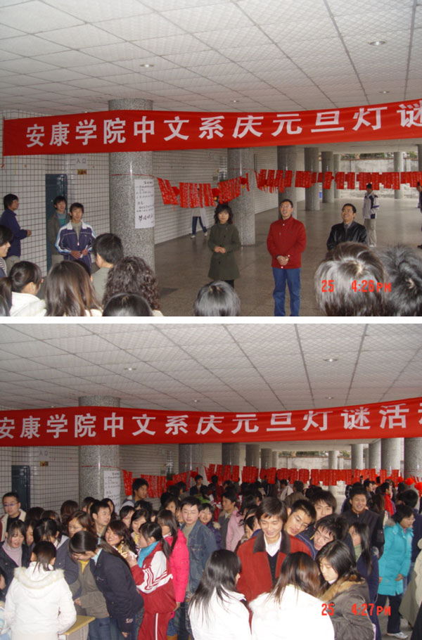 导航痕迹 首页 > 新闻通知 > 学院新闻 > 正文 学院新闻 通知公告 我系举行“庆元旦灯谜活动” 发布人: 发布日期:2008年01月04日 阅读次数: 为了弘扬传统文化,拓展同学们的文化视野、营造校园文化氛围、丰富同学们的课余生活,我系于12月25日下午4:30分在东校区一号教学楼大厅举办了“庆元旦灯谜活动”。 本次活动由我系主办,06级文秘班承办,设立灯谜依次分为易、中、难三等,答对灯谜者均有精美礼品赠送。我 系党总支书记沈军、团总支书记邹棠华、辅导员何媛出席并参加了本次活动。