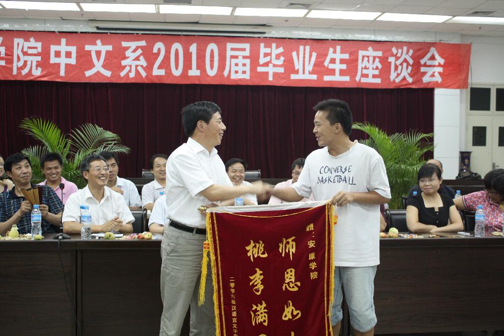 座谈会上,王瑛、孙鸿、李春平等老师作了发言,老师们殷切希望同学们心系母校,保持与母校的联系,常回家看看。毕业生结合自身学习和生活经历共同回顾了大学生活的点点滴滴和学院的发展变化,感谢几年来母校的培养和教导,是母校教会大家如何学习、如何生活、如何做人,是老师的传道、授业、解惑,为他们今后的成长发展打下坚实的基础。大家对老师们“以人为本”、兢兢业业的教学态度深表敬意。学院的人文关怀和细致周到的工作让大家在学习、生活上感到便捷和温暖。学生代表分别向学院和中文系赠送了锦旗,表达本届毕业生对学校的敬意和感激之情。