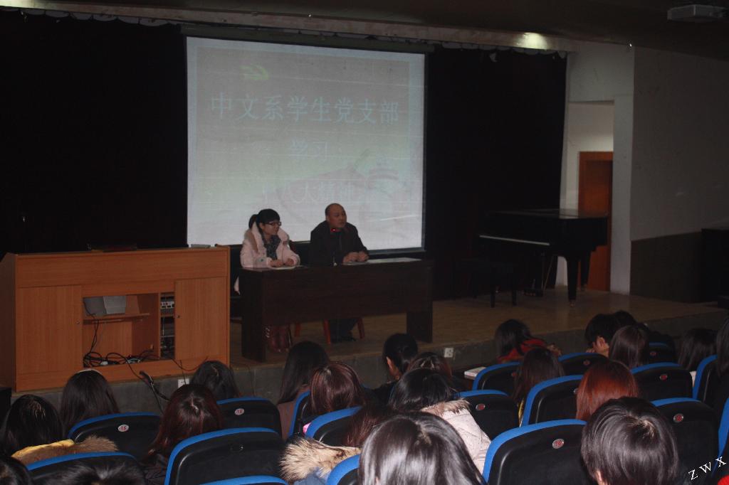 为了学习、贯彻党的十八大精神,落实《Beat365唯一官方网站关于学习贯彻十八大精神的通知》,12月12日晚上,中文系学生党支部在一号教学楼六楼报告厅组织学生党员集中学习十八大报告精神,学生第一党支部书记郝礼军、学生第二党支部书记沈菲、第一支部和第二支部的支委、学生党员、第7期发展对象、第34期入党积极分子共计200余人参加了会议。