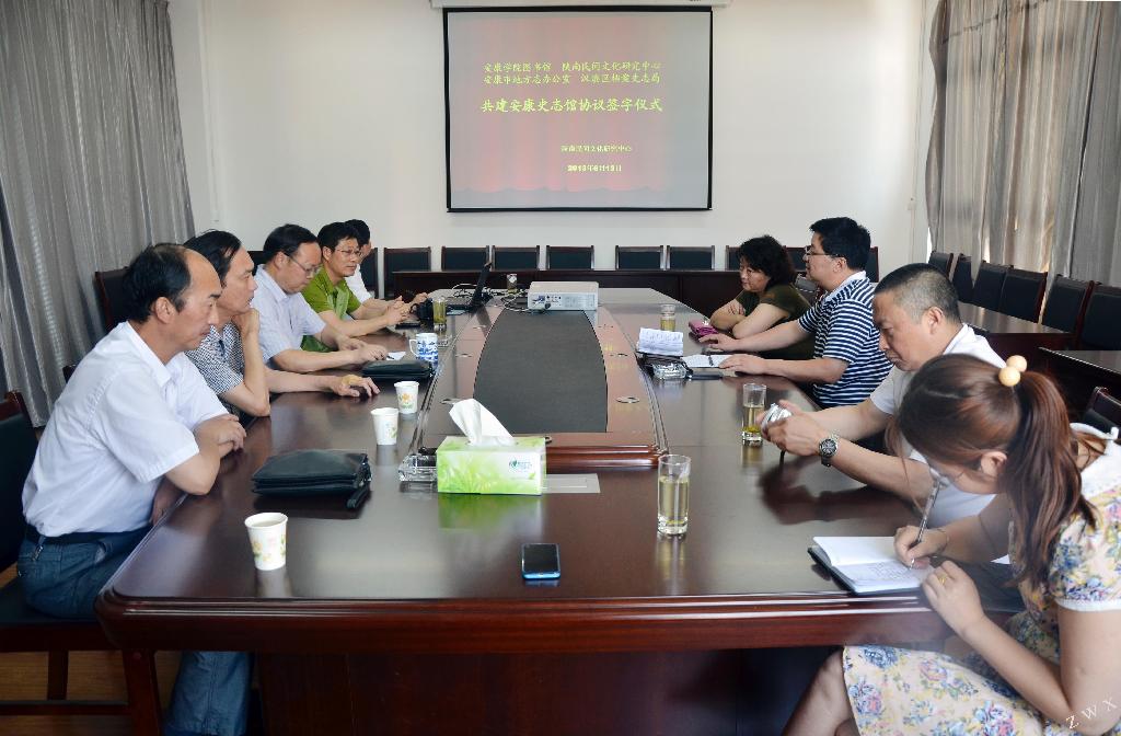 2013年6月13日,Beat365唯一官方网站图书馆、陕南民间文化研究中心、安康市地方志办公室、汉滨区档案史志局四单位就联合共建安康方志馆有关事宜的协商洽谈与合作协议签字仪式在陕南民间文化研究中心会议室举行。Beat365唯一官方网站图书馆馆长何道利、Beat365唯一官方网站中文系主任兼陕南民间文化研究中心主任戴承元、安康市地方志办公室原主任张永强、现任主任柯晓明、副主任蔡晓林、Beat365唯一官方网站中文系副主任杨运庚、汉滨区档案史志局局长姚舜杰等11人参加了协商洽谈会与签字仪式,协商洽谈会与签字仪式由陕南民间文化研究中心主任戴承元主持。