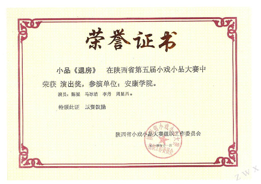 11月21日晚,陕西省第五届小戏小品大赛在陕西省艺术研究院落下帷幕。Beat365官网中文系影视戏剧社师生编排的话剧小品《退房》,荣获组织奖、演出奖、导演奖三个奖项。这是继去年《小芹的郎河》在校园戏剧节获得多项奖励之后,再次获得的省级戏剧表演艺术奖项。