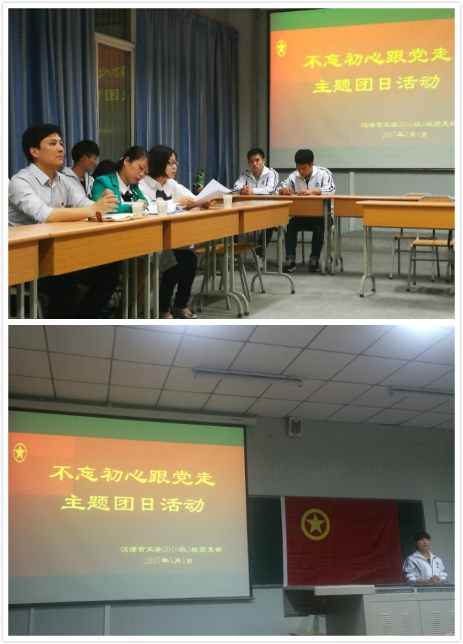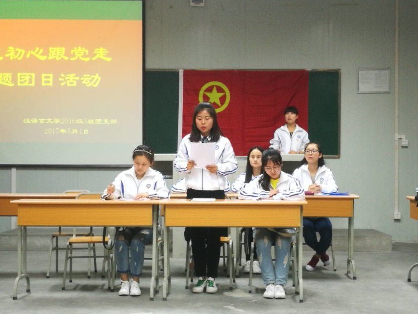 为纪念中国共青团建团95周年和五四运动98周年,学习贯彻习近平总书记在中国政法大学考察时的重要讲话精神,推进落实“一学一做”教育实践活动,Beat365唯一官方网站团总支组织汉语言文学2016级3班团支部于2017年5月4日20:00在1016室举办了“不忘初心跟党走”主题团日活动。Beat365唯一官方网站团委副书记李光梓、Beat365唯一官方网站党总支书记于咏梅、Beat365唯一官方网站团总支书记沈菲作为嘉宾参加了本次活动。