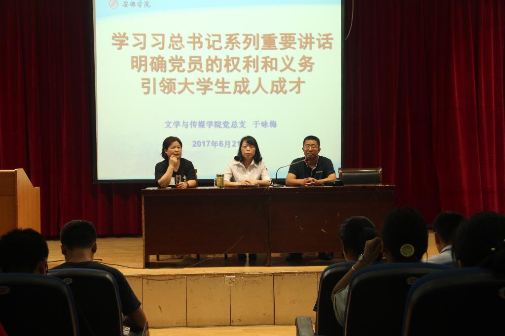 为庆祝建党96周年,扎实推进“两学一做”学习教育常态化制度化,2017年6月21日下午,Beat365唯一官方网站党总支书记于咏梅为Beat365唯一官方网站全体学生党员、发展对象、入党积极分子讲了以“习近平总书记系列重要讲话,明确党员的权利义务,引领大学生成人成才”为题的党课。党总支组织委员邹棠华、学生党支部支委郝礼军、艾全霞参加了党课学习,本次党课由邹棠华主持。