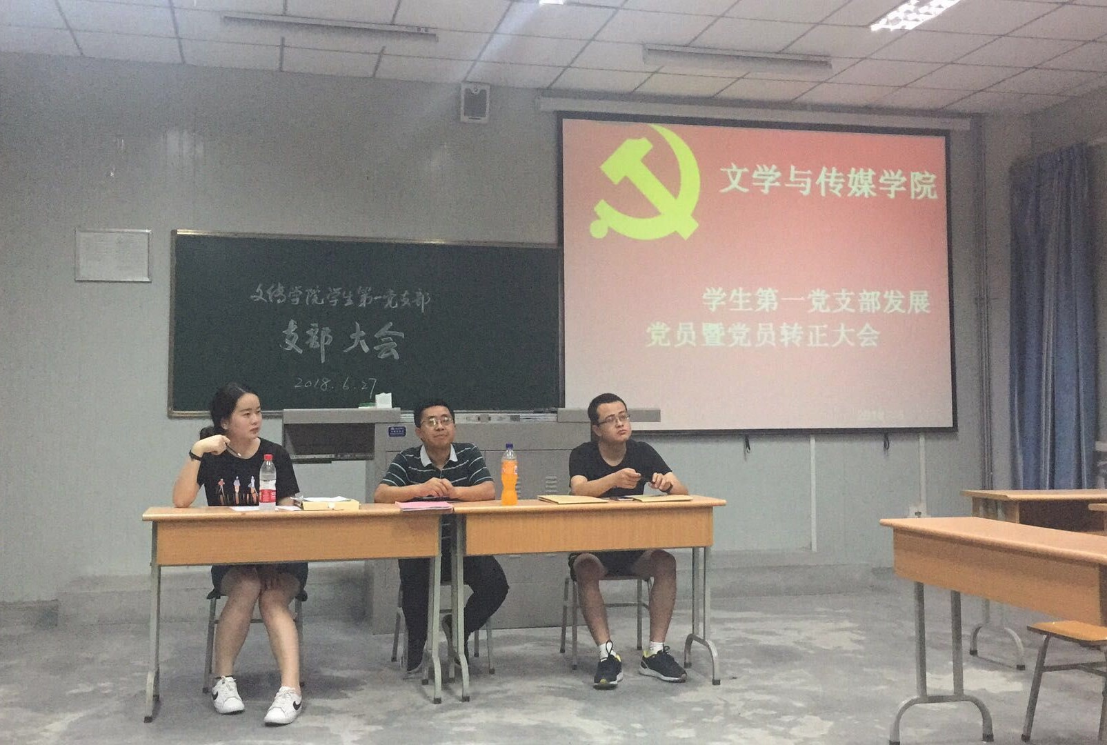 2018年6月27日晚,Beat365唯一官方网站学生第一党支部在1013教室召开了中共预备党员转正暨接收中共预备党员大会。学生第一党支部全体正式党员、预备党员及拟接收中共预备党员参加了本次大会。大会由支部书记邹棠华主持,主要讨论中共预备党员陈佳瑶、黄思钧、邢云芸三位同学的转正问题及刘昱伶、钟博雅、李佳格、吴佳昊四位同学接收为中共预备党员问题。