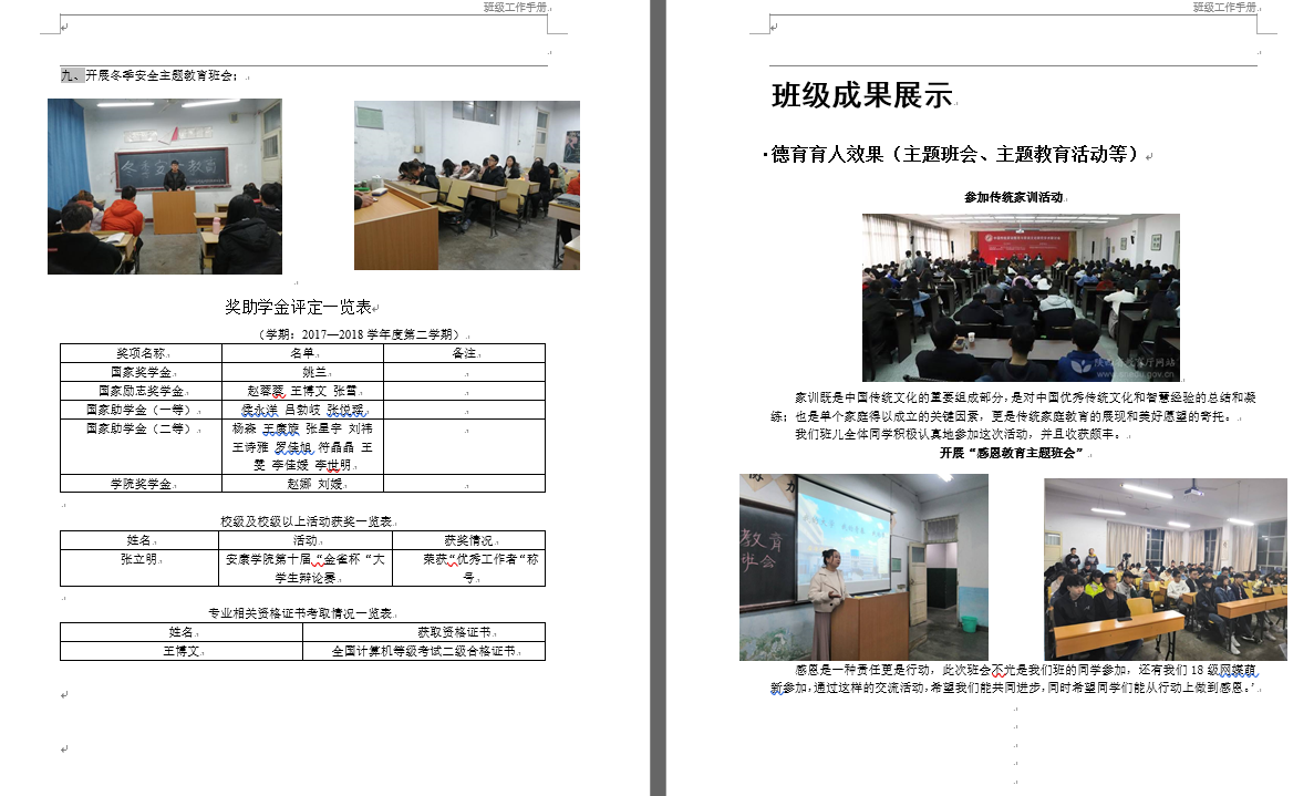 经过学生评选,评委评选,本着公平公正公开的原则,按照学生打分占30%,教师打分占70%的比例,对2016、2017、2018三个年级共计十六个班级近一年来的工作手册进行了考核和打分,同时此项打分将按照一定的比例折算计入文明班级评选得分,作为班级考核材料让文明班级的评选更公平合理。评选中发现,各班工作手册排版美观、布局合理、条理清晰、图文并茂,内容完备,是班级成员一学期成就和班干部一学期工作成果的集中展示,按照班级建设理念与发展规划,也提出了下一学期的工作展望。