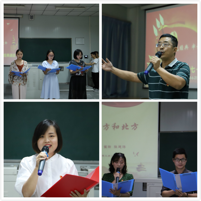 经典诵读环节,学生第一、第二党支部学生党员,教工第一、第二党支部倾情准备13个团体或个人诵读节目,学生们饱含激情的诵读了《有一首歌》《青春中国》《祖国啊,我亲爱的祖国》《颂五四,传屈骨》《七月的天空》《七一献歌》《我的祖国》《七一颂歌》《党旗颂》等经典诗歌、诗词和散文,深情地歌唱了《我和我的祖国》等经典爱国歌曲;教师崔瑜和张建涛诵读的《我的南方和北方》,李婷诵读的方志敏《可爱的中国》,邹棠华诵读的《毛泽东诗三首》将活动推向了高潮。诵读内容虽题材各异,但都声情并茂地表达了对党的崇高敬意和革命理想信念的坚定不移,铿锵有力,振奋人心,诵读者激情昂扬,听者热血澎湃,深深激发了全体师生的爱国热情。