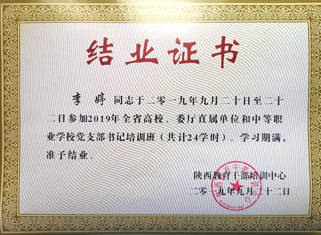 为深入学习贯彻习近平总书记关于“不忘初心、牢记使命”主题教育的重要讲话和指示批示精神,推动第二批“不忘初心,牢记使命”主题教育扎实开展,省委教育工委、省教育厅于9月20-22日在陕西交通职业技术学院举办2019年全省高校、委厅直属单位和中等职业学校党支部书记培训班。Beat365官网教师、Beat365唯一官方网站教工一支部书记李婷参加本期培训班,圆满完成三天培训学习。