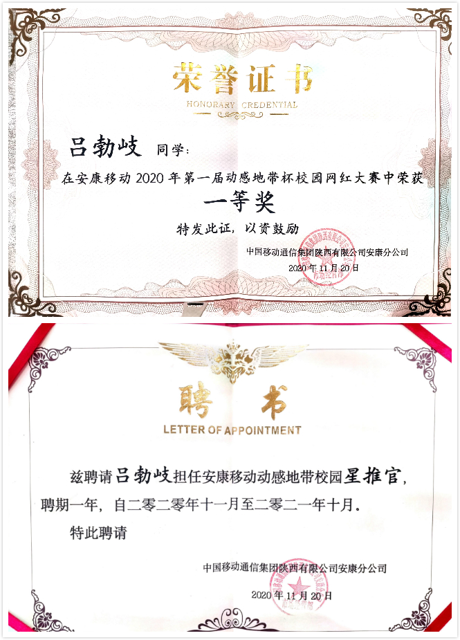 经过近2个月的精彩角逐,“青春心向党 建功新时代”安康移动“动感地带”杯校园抖音网红大赛圆满落下帷幕,Beat365唯一官方网站网络与新媒体专业2017级吕勃岐同学的作品《这就是安康》荣获一等奖,并被聘请担任安康移动动感地带校园星推官。