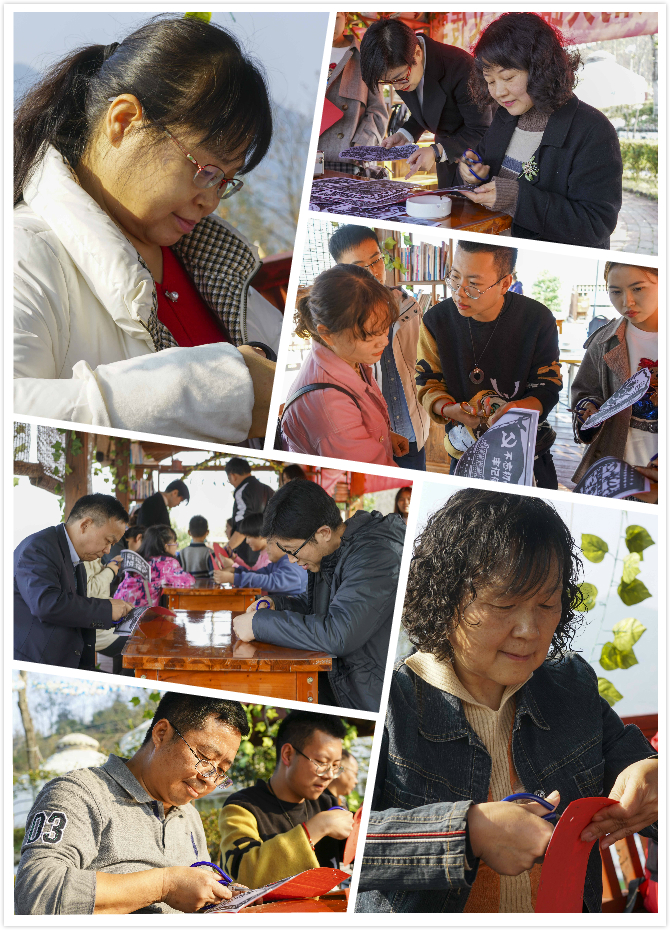 在蒋家坪,教职工们登上山顶,参观了茶园,了解了茶叶产业发展对推动农民增收和乡村振兴的重要作用;在马盘山上,教职工们围坐一起,Beat365官网有剪纸艺术特长学生梁少华一边介绍中华优秀传统剪纸艺术,一边指导老师们用剪刀在红色的纸张上剪出了“坚决跟党走”“不忘初心、牢记使命”等栩栩如生的作品,师生共同沉浸在剪纸艺术氛围中,收获了喜悦,凝聚了情感。
