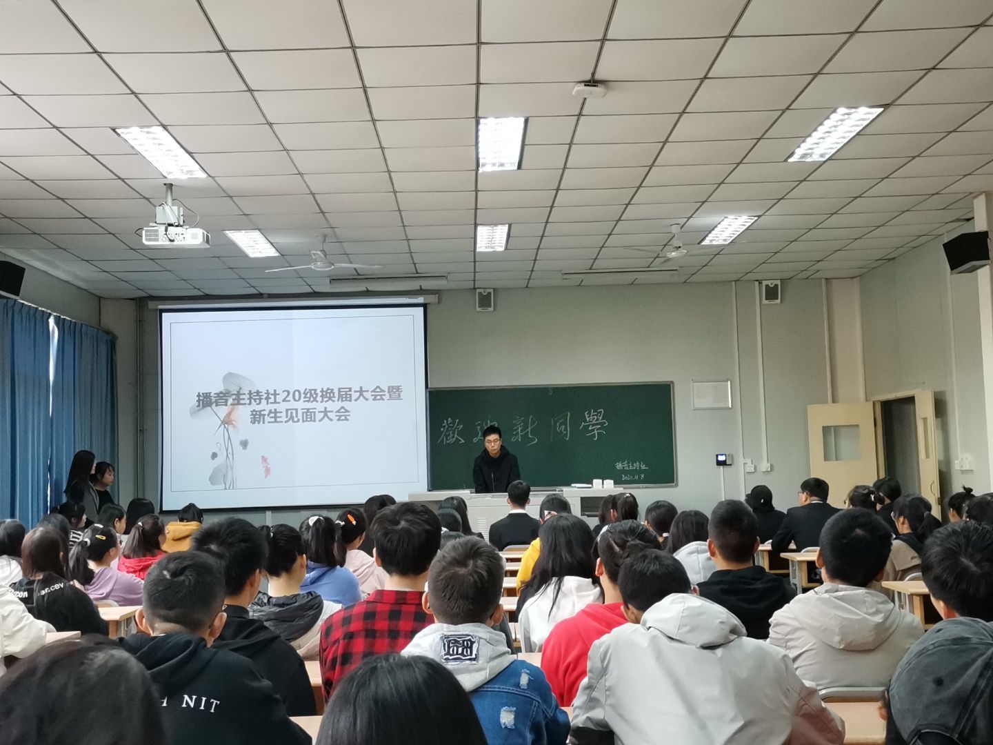 2020年11月8日上午9时,播音主持社在江南校区1012教室成功举办了2020年播音主持社换届大会曁新生见面大会,社团指导老师黄治强、社长刘佳妮、副社长李泉及96位社员参加了此次大会。大会由20级新进社员王云霞等主持。
