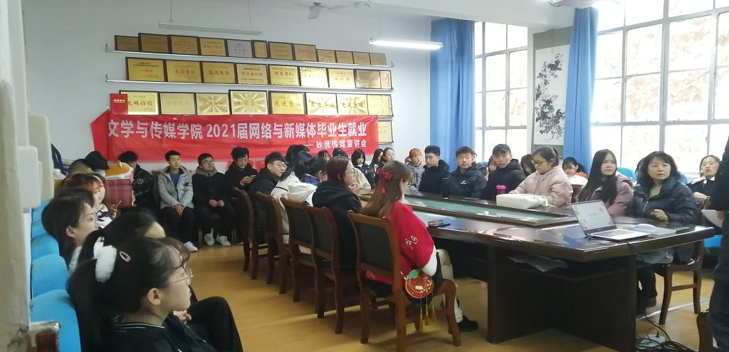 为了更好地拓宽毕业生就业渠道,2020年12月22日下午, Beat365唯一官方网站邀请陕西妙灵文化传媒有限公司在2307会议室举办了招聘宣讲会。会议由辅导员邹棠华主持,院党总支副书记杨海蓉及网络与新媒体、秘书学两个专业50余名学生参加了本次招聘宣讲会。