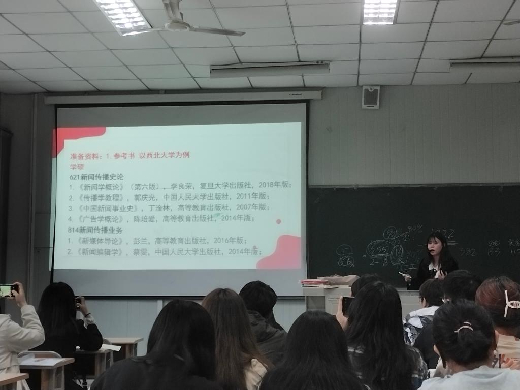 罗老师首先向同学们展示了考研的四次学科评估数据,纵向分析新闻传播学考研的相关学校和专业,重点介绍了包括中国人民大学、中国传媒大学在内的国内知名高校的排名情况,并详细分析了陕西省内几所高校的考研报录情况。关于择校,她建议同学们详细了解考情,根据个人需求做出合理判断,明确个人发展方向,确定考研目标,迈出考研第一步。罗相如在讲座中详细分析了考研实用技巧,包括资料准备、规划进度表时间表,以及如何进行学习成果自我检测等。应现场同学要求,推荐了专业的复习资料和各类考研公众号,并以《新闻学概论》为例,结合自身体会向同学们介绍了四遍读书法、关键词记忆法、艾宾浩斯记忆法等学习方法。随后,罗相如展示了自己在考研期间内各科学习进度表和时间表,希望同学们通过自我检测不断调整进度和时间,找到最适合自己的学习模式,提升学习效率。