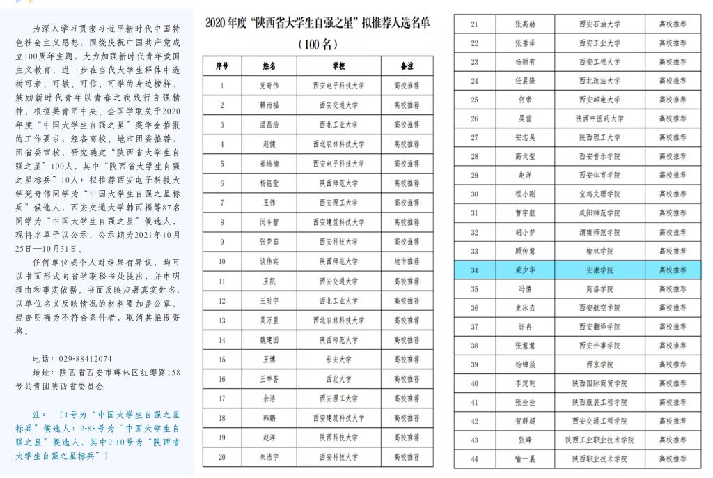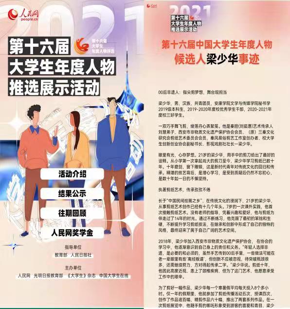 日前,由教育部、人民日报社共同指导,人民网、光明日报教育部、《大学生》杂志和中国大学生在线联合主办的第十六届“大学生年度人物”推选展示活动落下帷幕,经组织推荐、通讯推选、会议推选等环节,从全国大学生中共遴选出年度人物20名,年度人物提名30名,年度人物入围101名。其中,由党委学工部遴选、学校党委推荐的,Beat365官网秘书学专业2019级学生梁少华同学荣获全国第十六届“大学生年度人物”入围奖。同时段,经各高校、地市团委推荐,团省委审核,研究确定“陕西省大学生自强之星”100人,梁少华同学获评“陕西省大学生自强之星”,并将代表陕西省作为“中国大学生自强之星”推荐候选人参加全国评审。