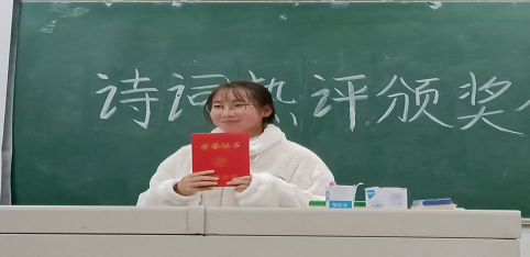 2021年11月26日星期五晚七点半,国学读书社于1022教室举行诗词热评活动的颁奖仪式。首先由主持人做活动开场致辞并且宣布获奖人员及作品名单,接下来由副社长张肖可为获奖同学颁奖:一等奖是21级汉语言文学4班孟巧红同学的《卜算子·我住长江头》;二等奖是20级汉语言文学3班张婷同学的《诗词热评》和20级应用化学2班王佳宁同学的《离思五首·其四》;三等奖分别是19级网络与新媒体邵鑫同学的《意难平》、20级应用化学2班王云霞同学的《双调·雨霖铃》和20级汉语言文学3班何曾同学的《一壶酒,慰风尘》。