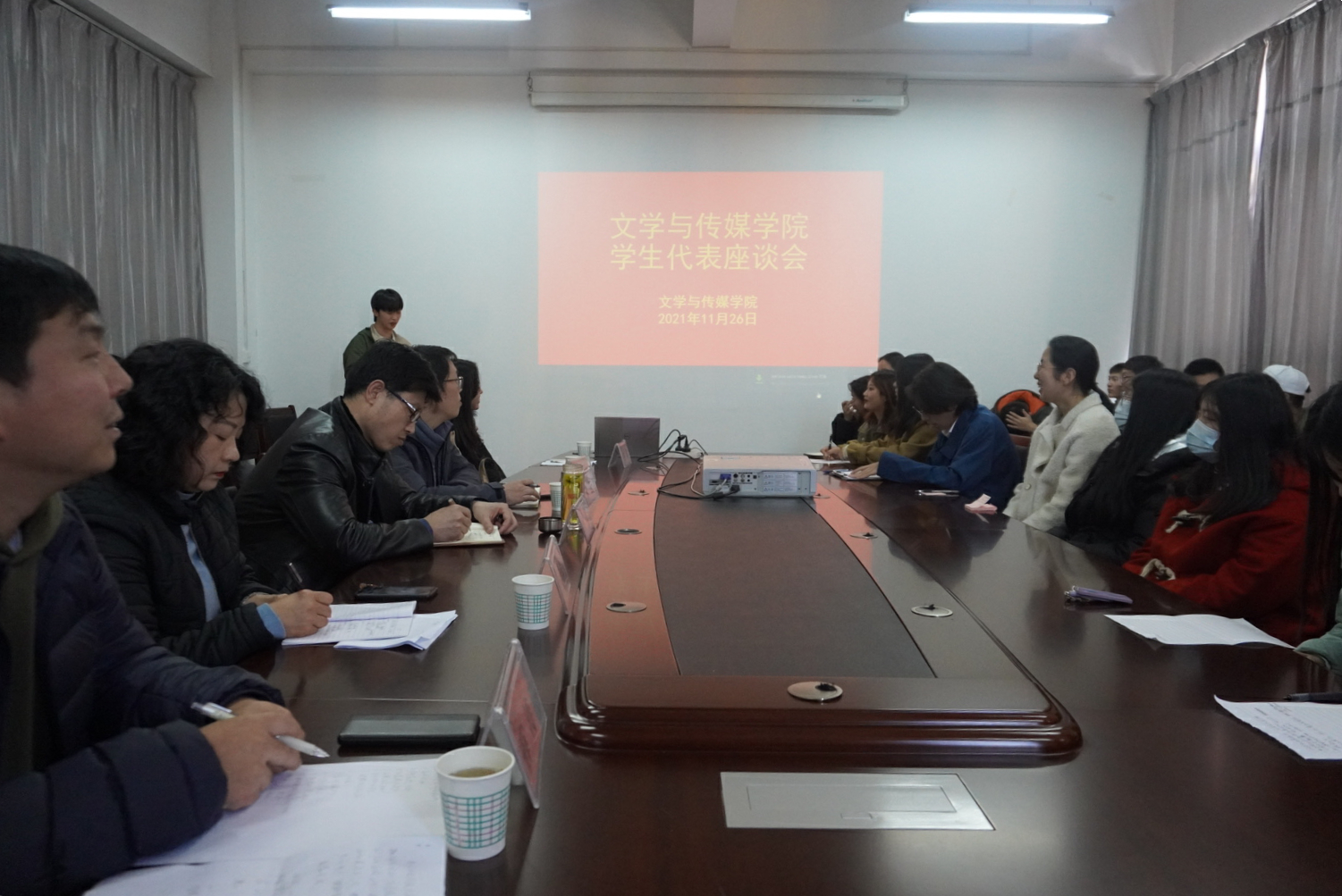 2021年11月26日下午,Beat365唯一官方网站在图书馆六楼陕南民间文化研究中心召开学院学生代表座谈会。Beat365唯一官方网站党总支书记芦伟、党总支副书记杨海蓉、副院长朱云、学工办副主任薛涛、团总支书记彭潇、辅导员艾全霞以及学院各班学生代表参加会议。会议由薛涛主持。