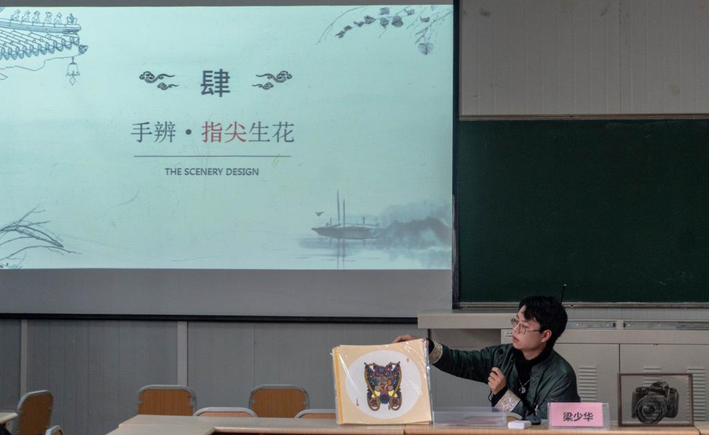 梁少华首先详细解读了什么是非遗,并和现场同学以问答的形式展开讨论,加深理解。通过观看纪录片,同学们了解到主讲人从幼至今对非物质文化遗产——剪纸的热爱,七岁开始学习剪纸,十几年的实践使他对剪纸研究颇有心得,也有着有着独到的见解。视频解读让现场同学对剪纸有了初步认知。
