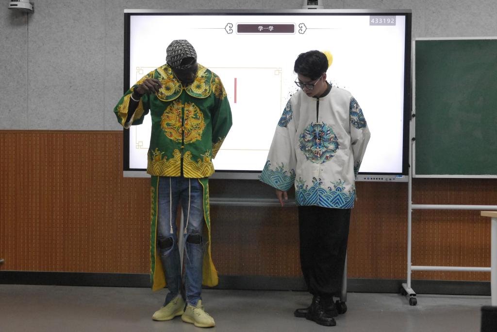 繁音激楚,热耳酸心,梁少华带领留学生了解秦腔基本概况、剧种起源,欣赏传统剧目。艺术无国界,虽然秦腔是地方剧种,现场留学生还是听得津津有味,并随着梁少华一起逐一认知秦腔四大行当,穿上戏服,体验秦腔的程式化动作,学生们有模有样的比划起来,现场气氛热烈。