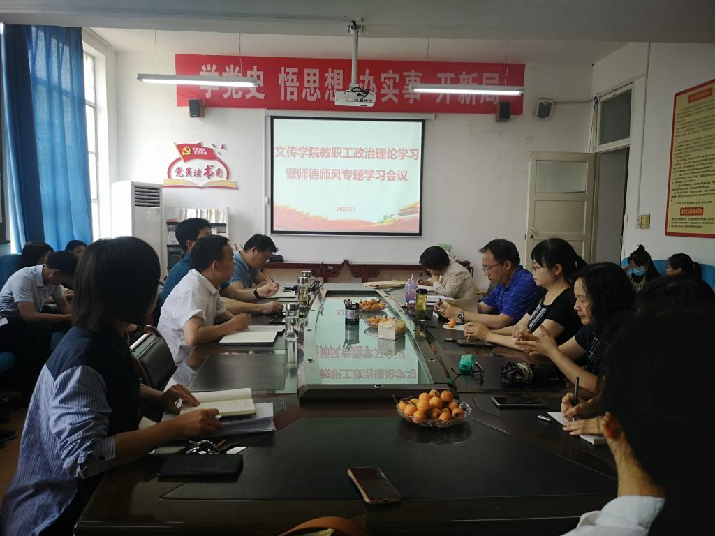 导航痕迹 首页 > 新闻通知 > 学院新闻 > 正文 学院新闻 通知公告 Beat365唯一官方网站召开教职工政治理论学习暨师德师风专题学习会议 发布人:Beat365唯一官方网站 发布日期:2022年06月04日 阅读次数: 6月1日下午,Beat365唯一官方网站在2307召开教职工政治理论学习暨师德师风专题学习会议,Beat365唯一官方网站全体教师参加会议,会议由院长杨运庚主持。 党总支书记芦伟首先领学了《关于实行以增加知识价值为导向分配政策的若干意见》有关条款及解读,并通报了违反高校教师职业行为十项准则典型案例,进行了现场互动探讨——基于“经济人”假设的高校教师社会兼职的表征及制度规范。随后,全体教师一起观看了学习视频《我和我的信仰——劳模精神讲述》。芦伟要求,全体教师要高度重视师德师风建设,守好教师的职业道德底线,切实履行立德树人职责。 杨运庚强调,师德师风建设要落实到教书育人全过程,全体教师要提高站位、坚定信念,以规立德、自警自省,教育者要先受教育,堪当学生的榜样,做好学生成长路上的引路人。 撰稿/摄影/发布/崔瑜 审核/芦伟