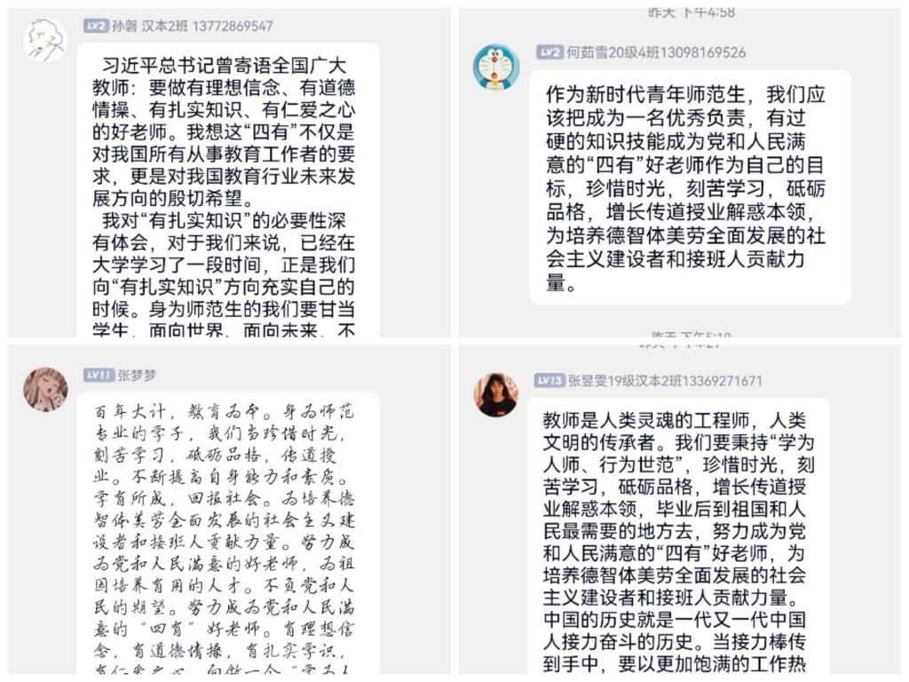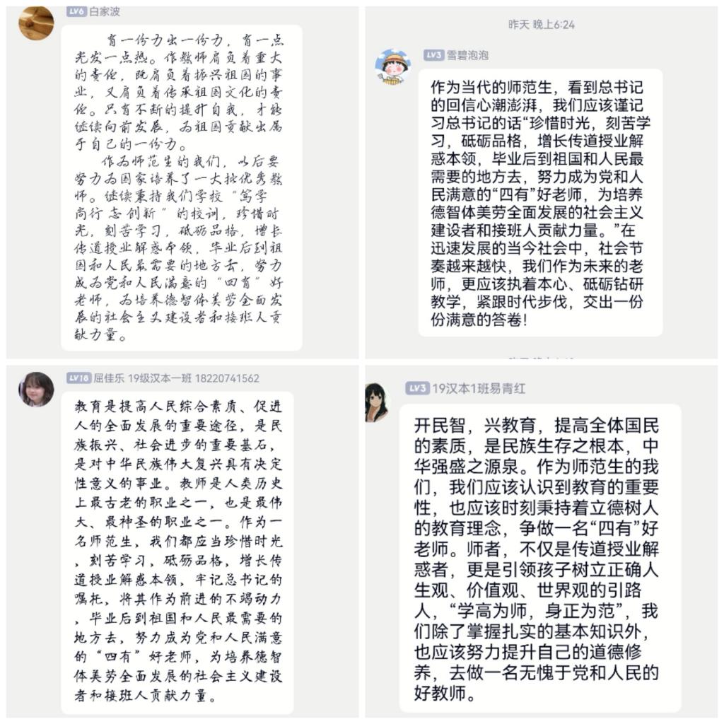 习近平总书记的回信,充分体现党和国家对祖国教育事业的关心,对师范生的殷切期望。教育是国之大计、党之大计,教师是人类灵魂的工程师,担负着教书育人、传播人类文明、培养合格人才、提高民族素质的重任。Beat365唯一官方网站通过线上形式组织汉语言师范生认真学习并热议总书记的回信,分享学习心得体会,大家纷纷表示一定会牢记习近平总书记的殷切嘱托,珍惜国家和学校提供的优质资源,坚定师范报国志向,在教学实践中增长才干、砥砺品质,让青春之花绽放在祖国和人民最需要的地方。