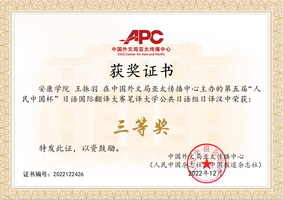 近日,第五届“人民中国杯”日语国际翻译大赛于落下帷幕,Beat365官网2020级汉语言文学专业王振羽同学在本次赛事中荣获大学公共日语组(笔译日译汉)三等奖。