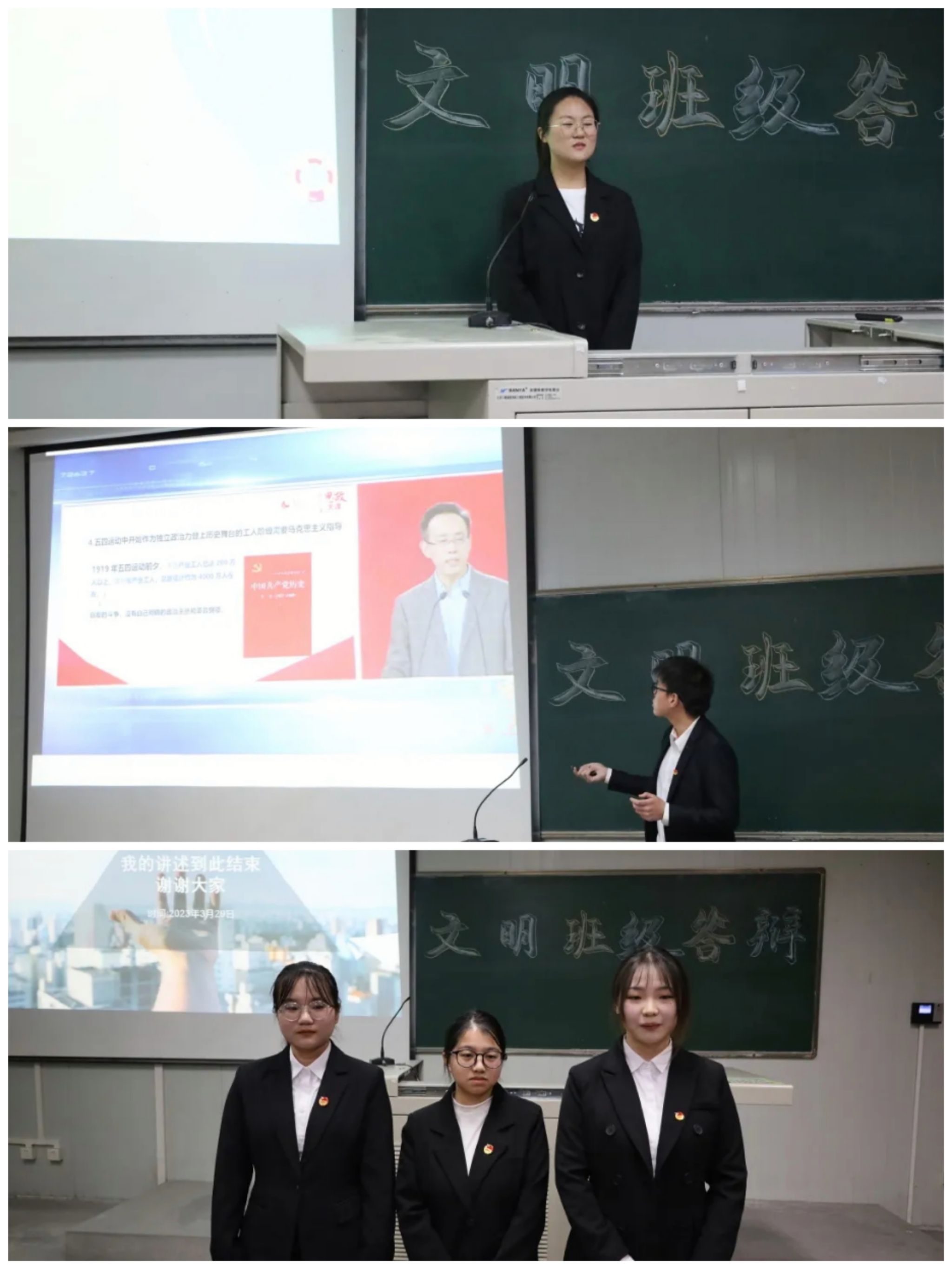 各班级代表通过PPT和现场陈述的方式,生动展示了班级在组织建设、思想政治教育、学风建设、班级管理、班级文化建设、班级特色文体活动等方面取得的成绩,各具特色,亮点频出,呈现出团结向上、开拓进取、求实创新的班级风貌。答辩环节,各级各班代表思路清晰,表达流畅,展现了当代大学生良好的青春风采,也获得了评委老师的一致好评。