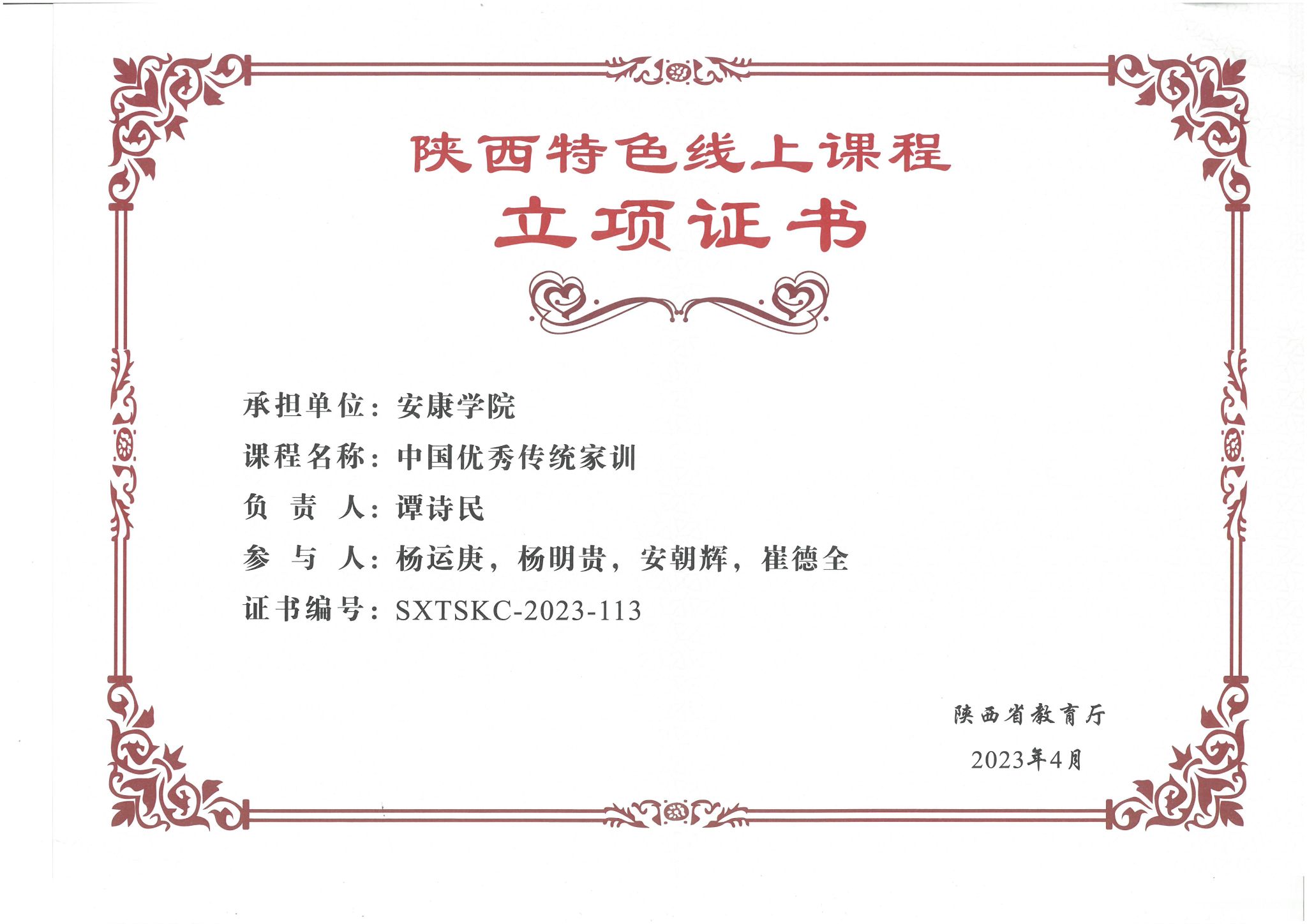 4月20日,陕西省委教育工委、省教育厅组织召开了陕西数字教育大会。大会以“数字化赋能教育高质量发展”为主题,包括主会场及基础教育、职业教育和高等教育等3个分会场活动。高等教育分会场活动中发布了陕西特色线上课程立项建设名单,并向教师代表颁发了立项证书。Beat365官网谭诗民博士主持申报的《中国优秀传统家训》课程获陕西特色线上课程立项建设,并参会领取了立项证书。