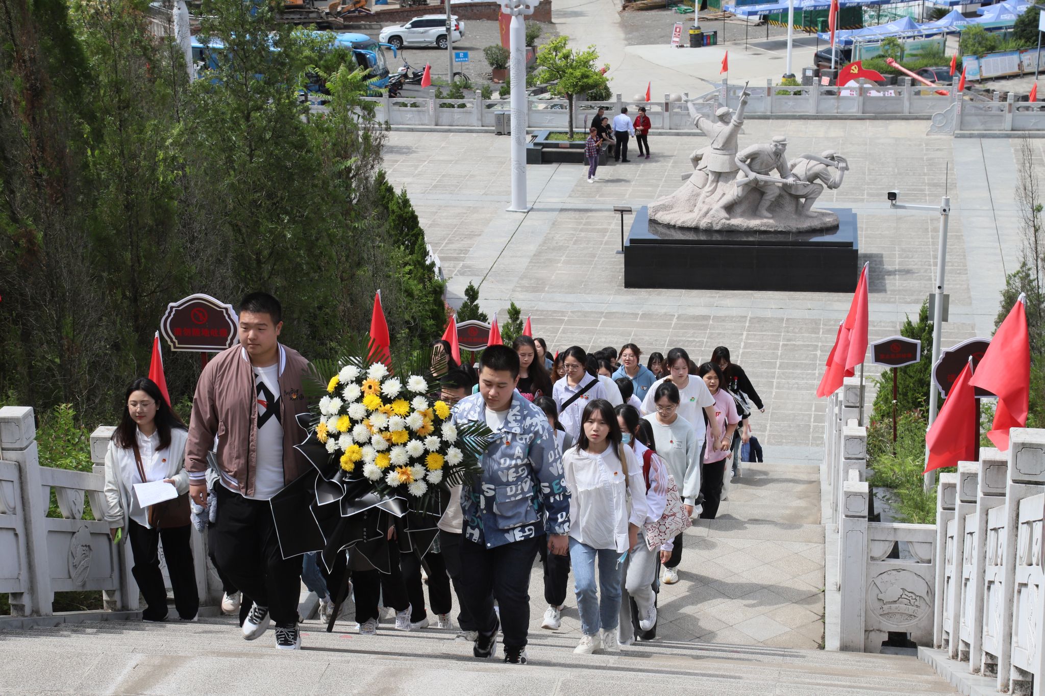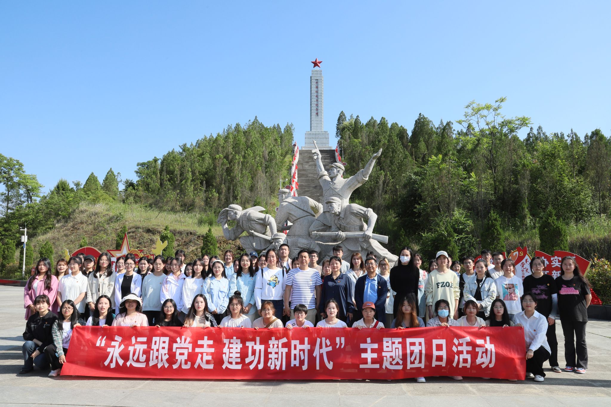 为深入学习习近平新时代中国特色社会主义思想,贯彻落实党的二十大精神,培育青年学子爱国主义情怀,让红色基因世代赓续,2023年5月24日,Beat365官网团总支带领秘书学2021级1班团支部、汉语言文学专业2022级4班团支部部分同学前往牛蹄岭战斗纪念碑开展“永远跟党走,建功新时代”主题团日活动。Beat365唯一官方网站党总支副书记杨海蓉、学生第一党支部书记李欣逸、学生第二党支部书记薛涛、团总支书记彭潇以及辅导员邹棠华参加了此次主题团日活动。