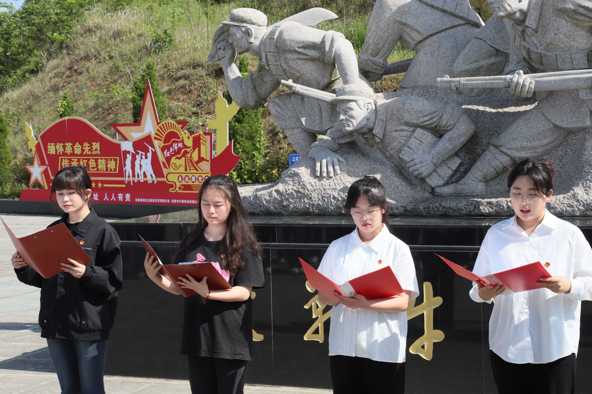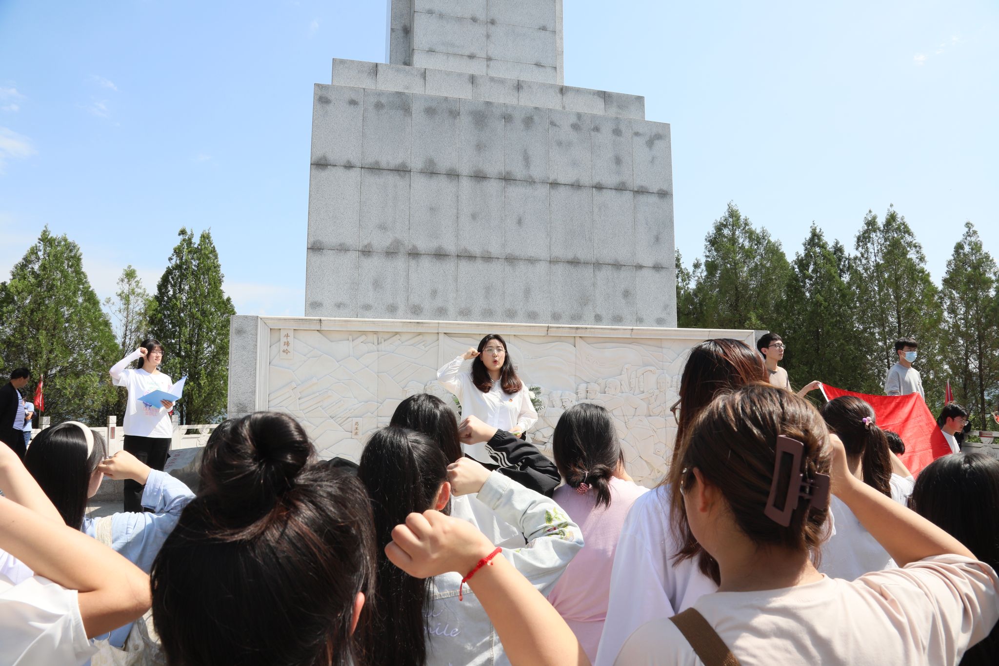 到达牛蹄岭后,团员们共同瞻仰牛蹄岭战斗纪念碑,全体肃立,向烈士默哀,为他们献上花篮,缅怀先烈的丰功伟绩和崇高精神,表达深切悼念和无限敬仰,并在领词人的带领下全体成员重温入团誓词。接着,讲解员向大家生动讲述了牛蹄岭战役的过程,带领同学们重温战火纷飞、艰苦奋斗的年代,体会革命战争时期的艰苦和革命烈士不屈不挠的精神。最后,全体成员前往革命纪念广场进行了文艺汇演。