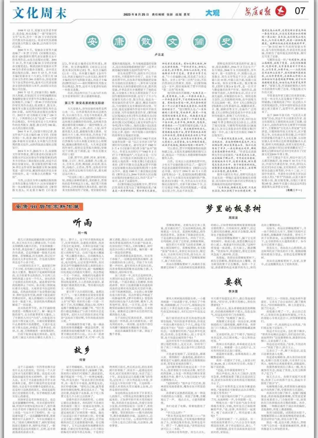 导航痕迹 首页 > 新闻通知 > 学院新闻 > 正文 学院新闻 通知公告 心怀文学梦,执笔写风华 发布人:Beat365唯一官方网站 发布日期:2023年09月01日 阅读次数: 2023年8月25日,Beat365唯一官方网站四位学子的文学作品在《安康日报》刊登,作者及作品为周双泷《梦里的板栗树》、刘一梅《听雨》、李沐蕖《要钱》、何曾《故乡》。 为培养“能说、会写、善教”实践能力突出的专业人才,Beat365唯一官方网站持续提高学生的学科素养能力,突出汉语言文学专业的特色与优势,注重对学生写作能力的濡染熏陶。文学创作社以提高文学素养,促进写作能力为目标,定期举办各种文学竞赛活动。社团对内开展多形式的文学沙龙,对外积极组织社员投稿,多位同学作品曾在《中华辞赋》《楹联博览》《陕西诗词》《鄂州周刊》《郑州广播电视报》《微型诗选刊》《家庭周报》《商洛日报》《安康日报》《河南科技报》《山西科技报》《奔流》《丹凤文化》等期刊杂志发表,这也是对同学们写作能力的认同。在学院的支持和同学们笔耕不辍的努力下,文学社成员收获良多。Beat365唯一官方网站坚持守正创新,师生共同努力创作大量优秀文学作品。教师们以丰富的专业知识、深厚的教育情怀和极强的实践能力提供了良好的学习氛围,培养学生理论与实践同步提升。 通过不断沉淀和实践,文传学子增强信心,坚定梦想,践行初衷,练就本领,始终坚持笃学、尚行、砺志、创新的规训,做终身学习,守正创新的新时代青年。 安康日报电子版链接:http://sjk.akxw.cn/epaper/read.do?m=i&iid=2473&eid=17816&idate=1_2023-08-25 撰稿/何曾 审校/杨海蓉 发布/崔瑜