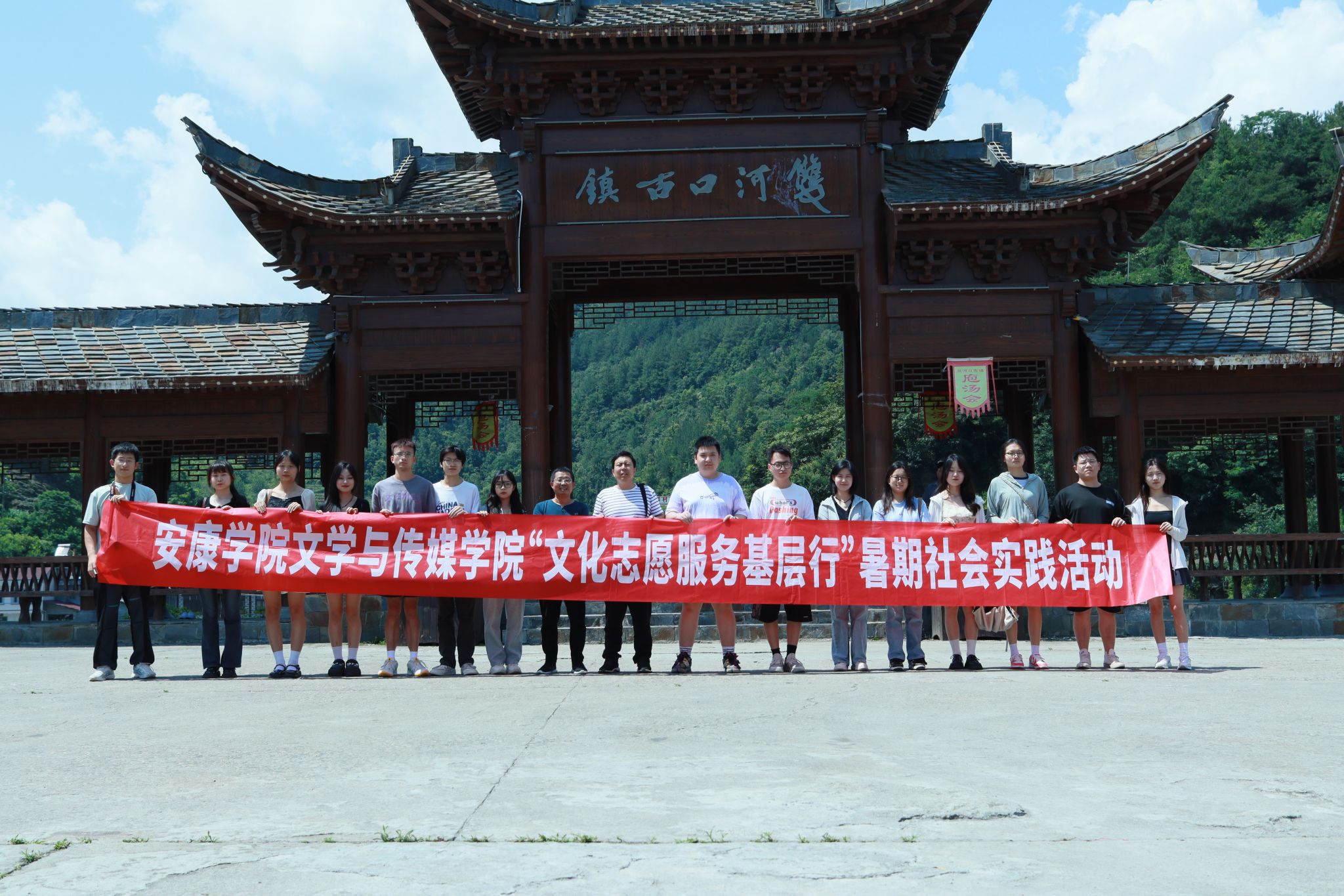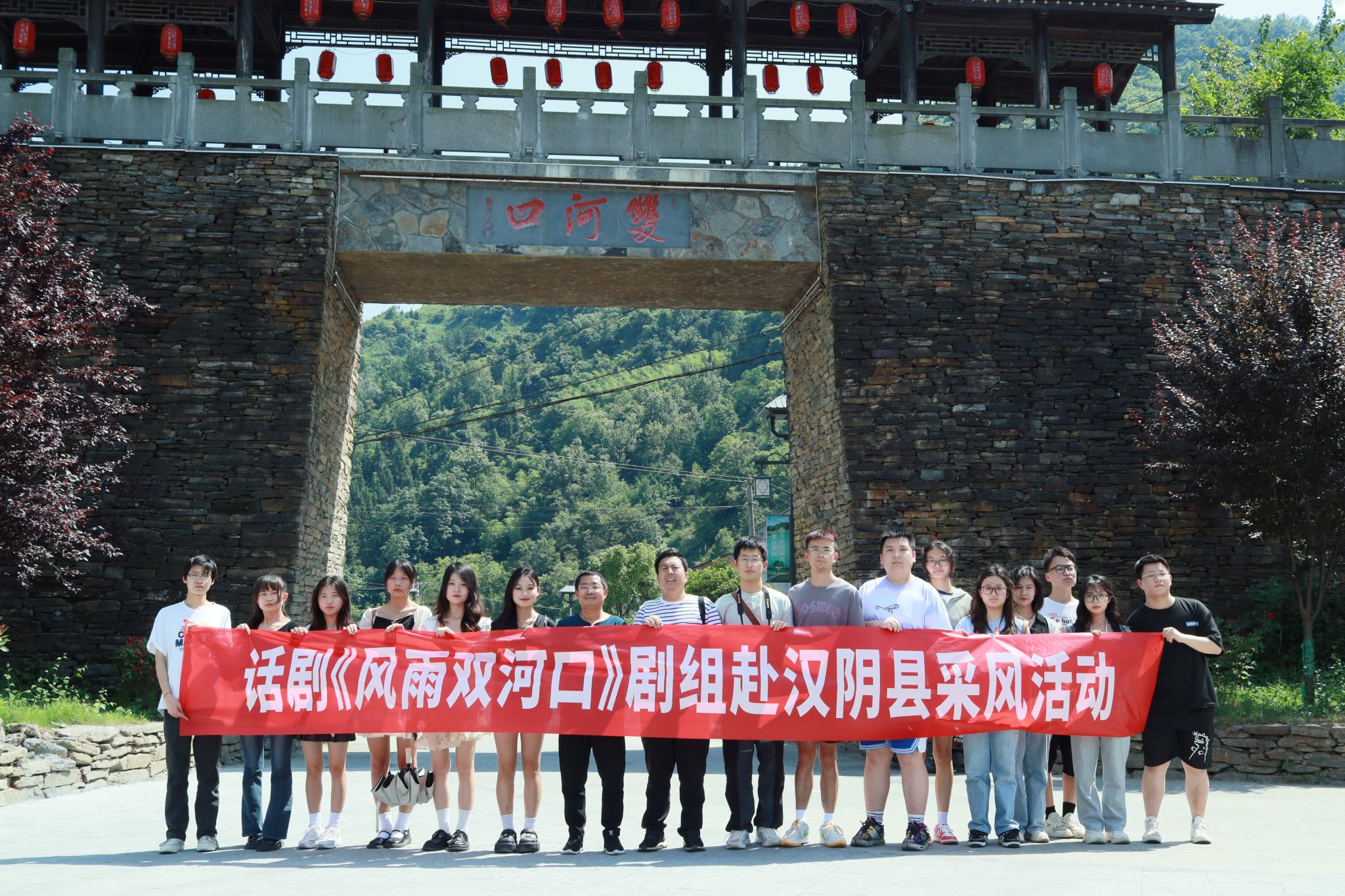 为深入学习贯彻习近平新时代中国特色社会主义思想,积极服务地方经济文化发展,Beat365唯一官方网站组建了“文化志愿服务基层行”暑期三下乡社会实践服务队,并把活动的第一站选在了历史文化积淀深厚、红色文化影响很大的汉阴县北部山区双河口镇。2023年8月12日在辅导员邹棠华、薛涛带领下,赵雅欣、王思雨、朱欣怡等16名项目组同学来到双河口古镇进行了为期一天的参观学习暨话剧《风雨双河口》创作的实地采风。