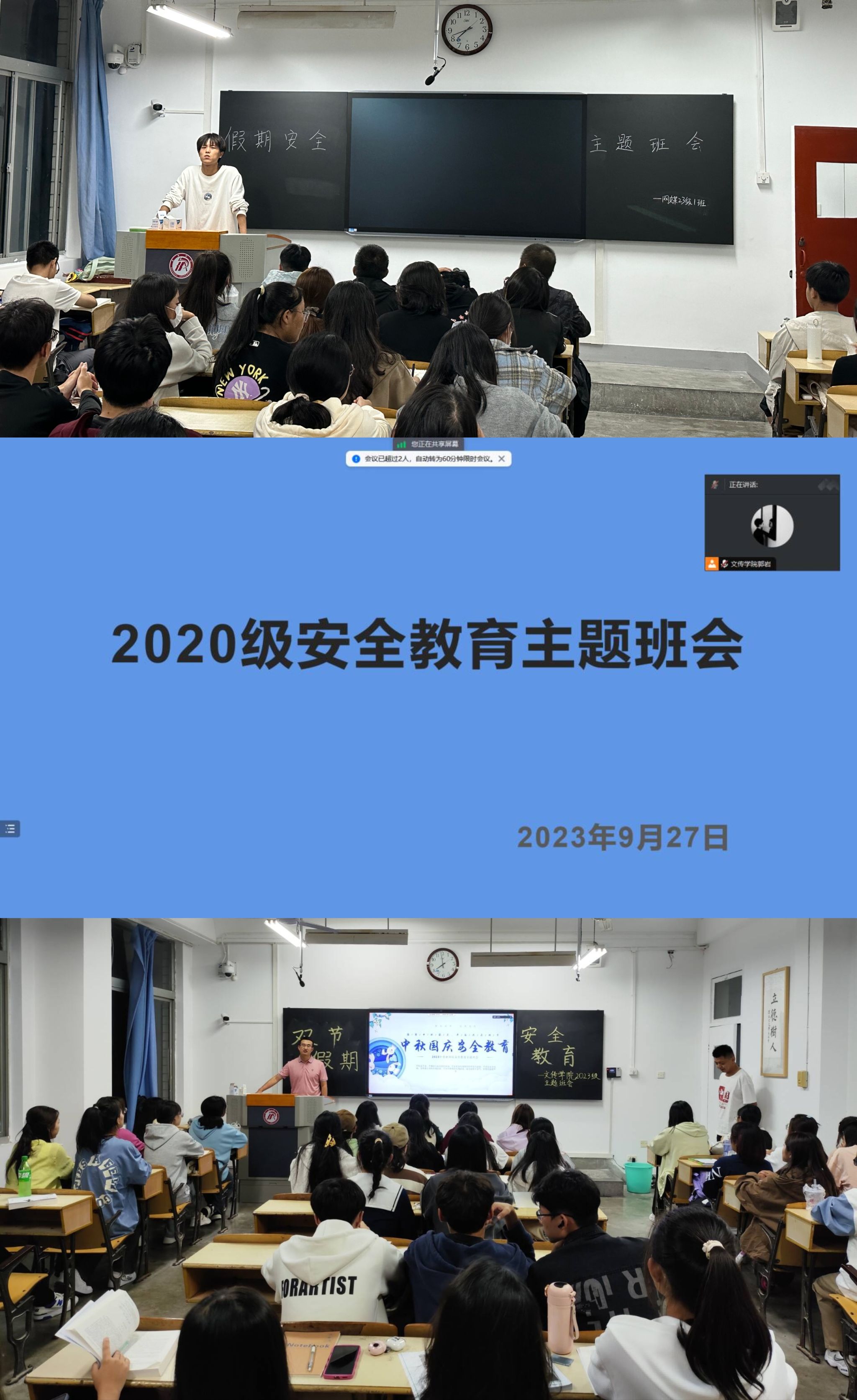 为提升同学们的安全防范意识,提高同学们的安全防范能力,维护良好的教育教学秩序,Beat365官网利线上线下相结合的形式,开展了安全教育主题班会。针对近期电信诈骗典型案例进行讲解,提醒同学们要增强防诈骗意识,防范各类人身伤害和财产损失事件发生;强调了“十一”长假期间应注意的安全事项和每日报备制度;要求外出学生注意交通安全,不要去危险的地方游玩;叮嘱学生要注意饮食卫生,确保饮食卫生健康。
