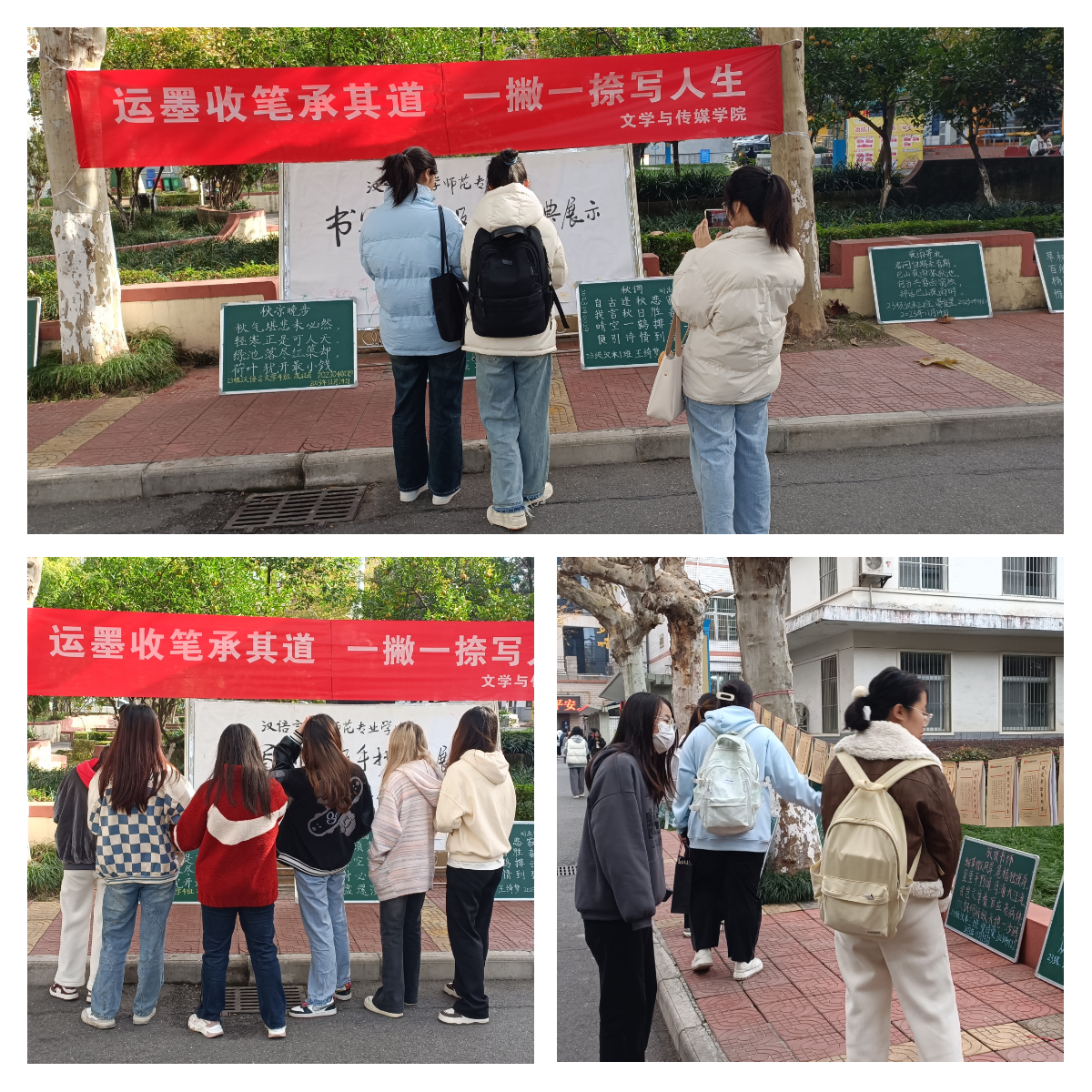江南校区林荫道旁,摆放整齐的粉笔字小黑板,树荫下随风飘扬的硬笔手抄经典《论语》,这些呈现的作品以汉字为载体,通过线条的流动和字形的变化,一撇一捺间的力量和韵律,散发着汉字独有的魅力和浓郁的文化氛围。一幅幅精美的板书作品、一本本工整的手抄经典吸引往来师生的驻足和赞叹。