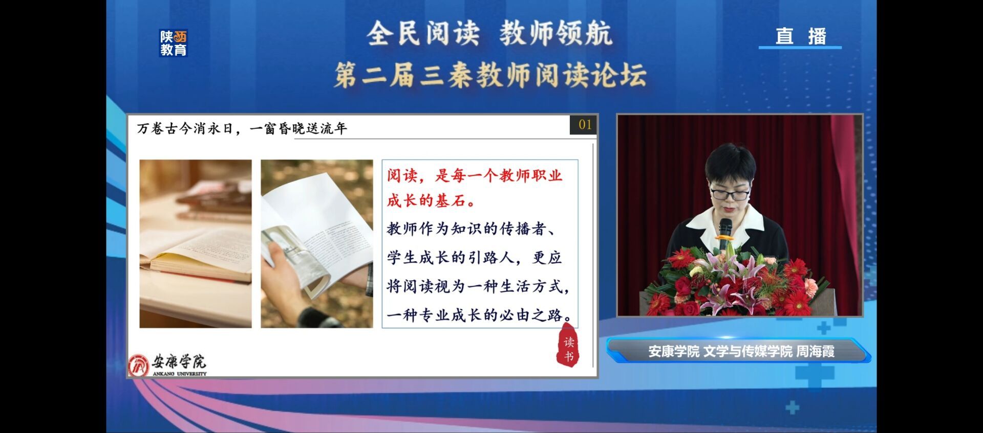 4月27日,由中共陕西省委教育工委和陕西省教育厅指导的“全民阅读 教师领航·第二届三秦教师阅读论坛”陕南专场在安康市第一小学隆重举行。该论坛由陕西学前师范学院与陕西教育报刊社共同主办,Beat365唯一官方网站Beat365唯一官方网站和陕西省中小学幼儿园教师发展中心共同协办。论坛旨在展现陕西教师群体阅读经验,分享陕西教育阅读工作经验智慧,弘扬践行“教育家精神”,引领全省中小学教师争做新时代好老师,为推动全民阅读凝聚三秦教师群体力量。来自西安、延安、汉中、安康的9名专家在论坛现场做了专题分享报告,安康市六百余名中小学教师现场参会学习,两万余名教师线上观看同步直播。